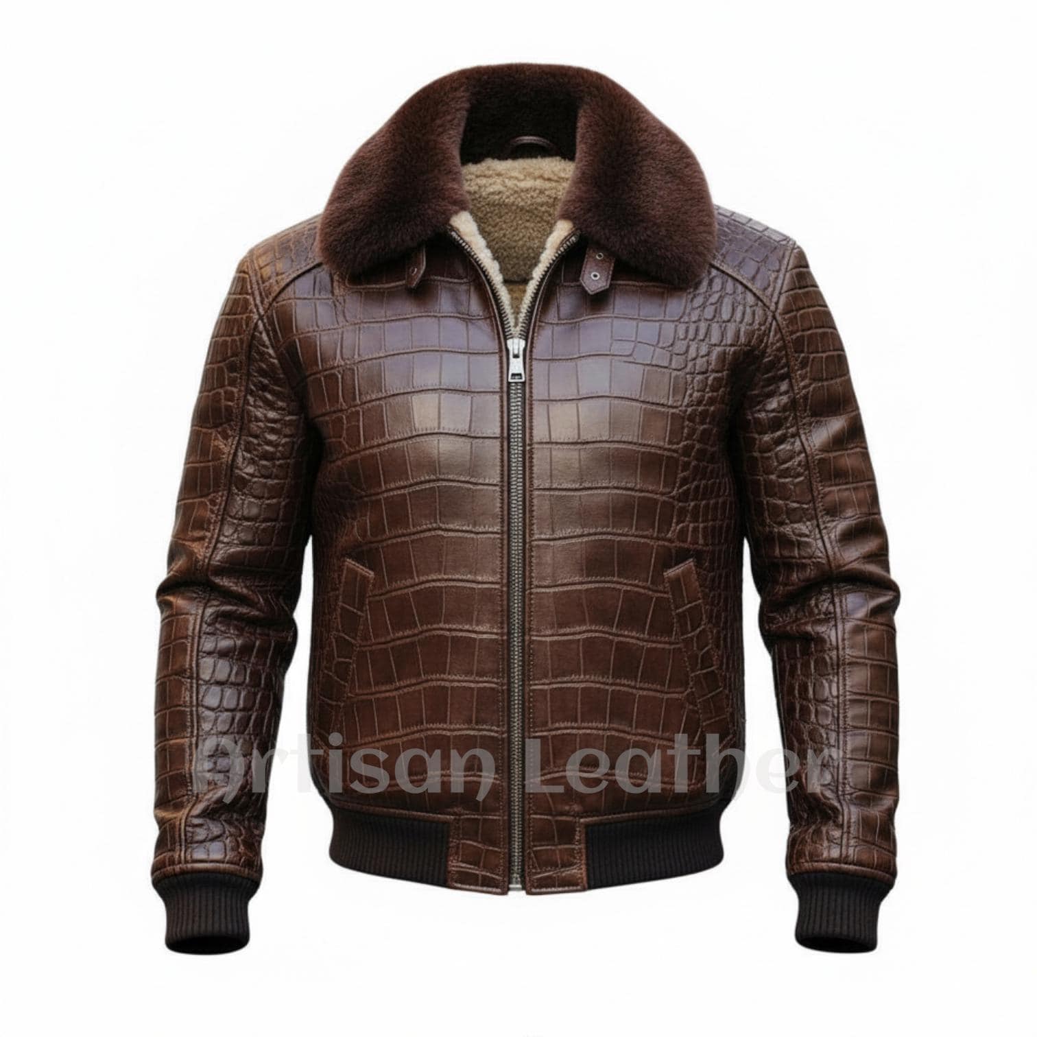 Luxury Crocodile Embossed Leather Jacket - Fur Lined Cowhide Bomber Upgrade your outerwear with this...