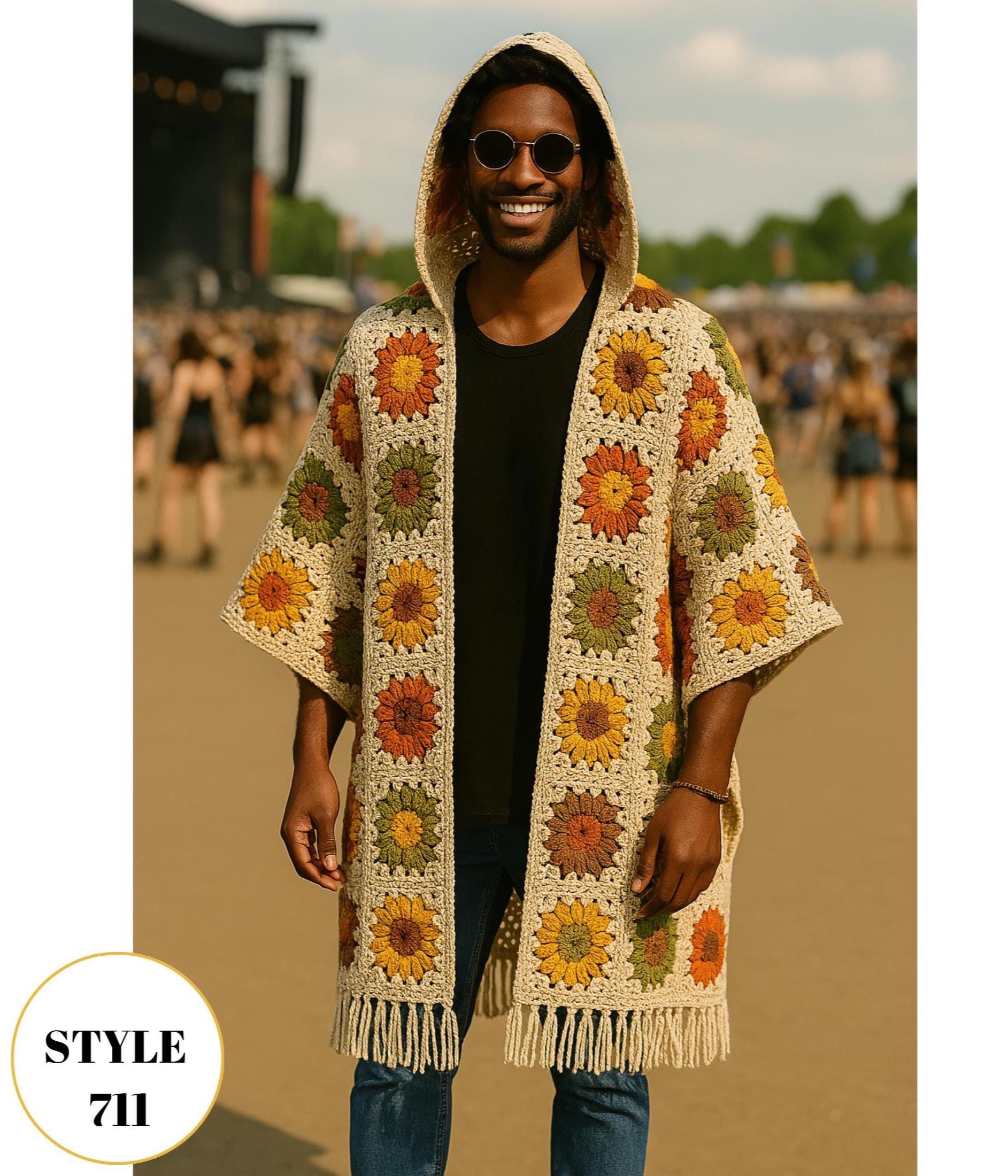 "Crochet Hooded Cardigan Men, Granny Square Cardigan Men's Festival Outfit Fringe Cardigan, Men...