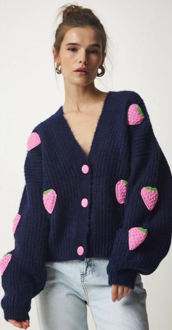 Strawberry Cardigan, Navy Cardigan, Women Cardigan, V Neck Cardigan...