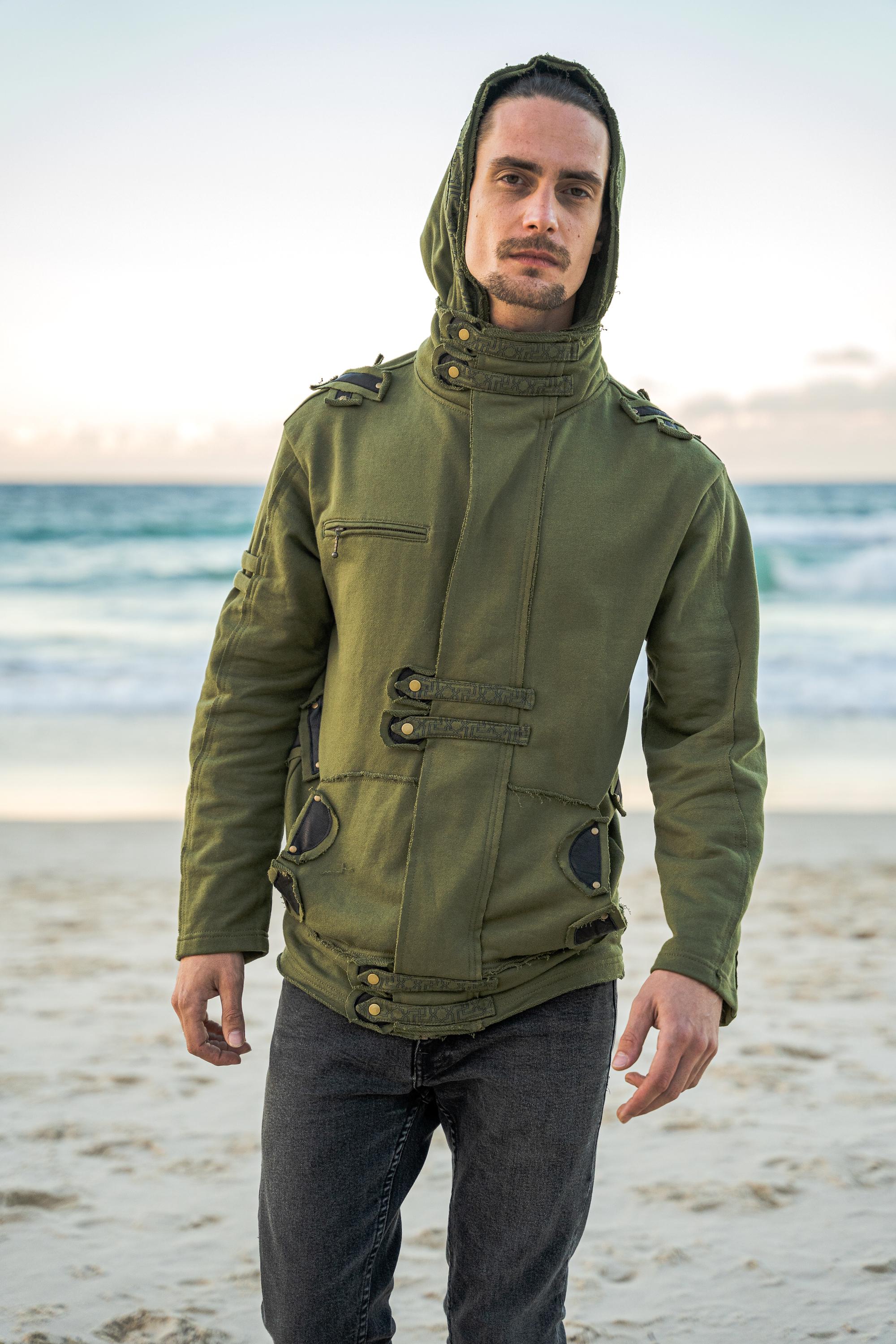 Men Green Jacket With Hoodie, Cyberpunk Jacket, Festival Clothing, ...