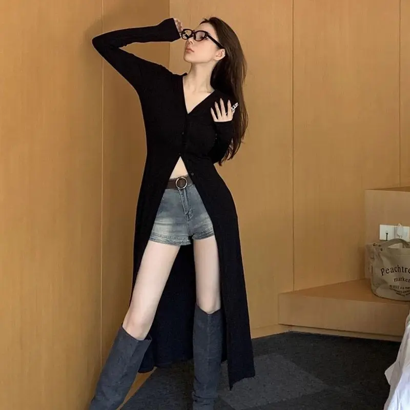 Spring and summer long thin design sense small temperament black V-neck long-sleeved coat cardigan t...