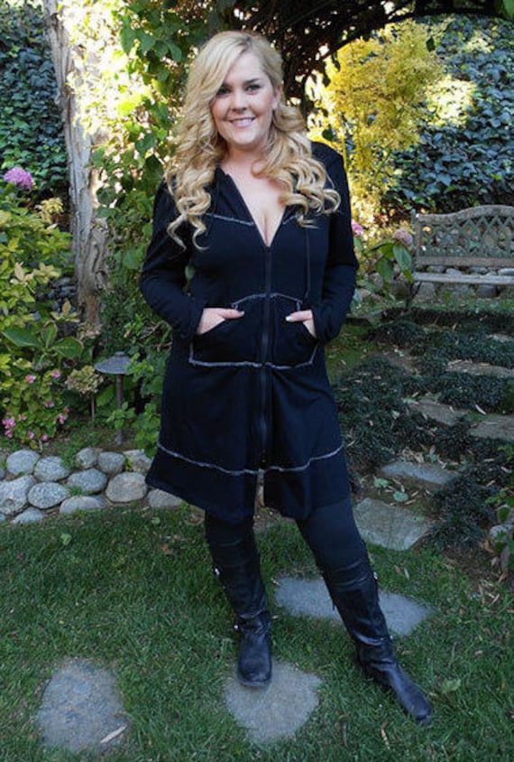 "Long Hoodie, Black Cotton Hoodie, Zip Up Hoodie, Maxi, Front Pockets, Black Jacket, Small Only...