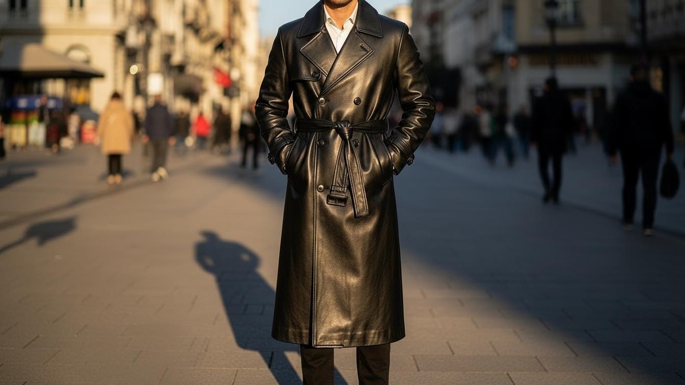 "Elevate your style with this timeless Men's Black Leather Trench Coat, designed for both sophi...