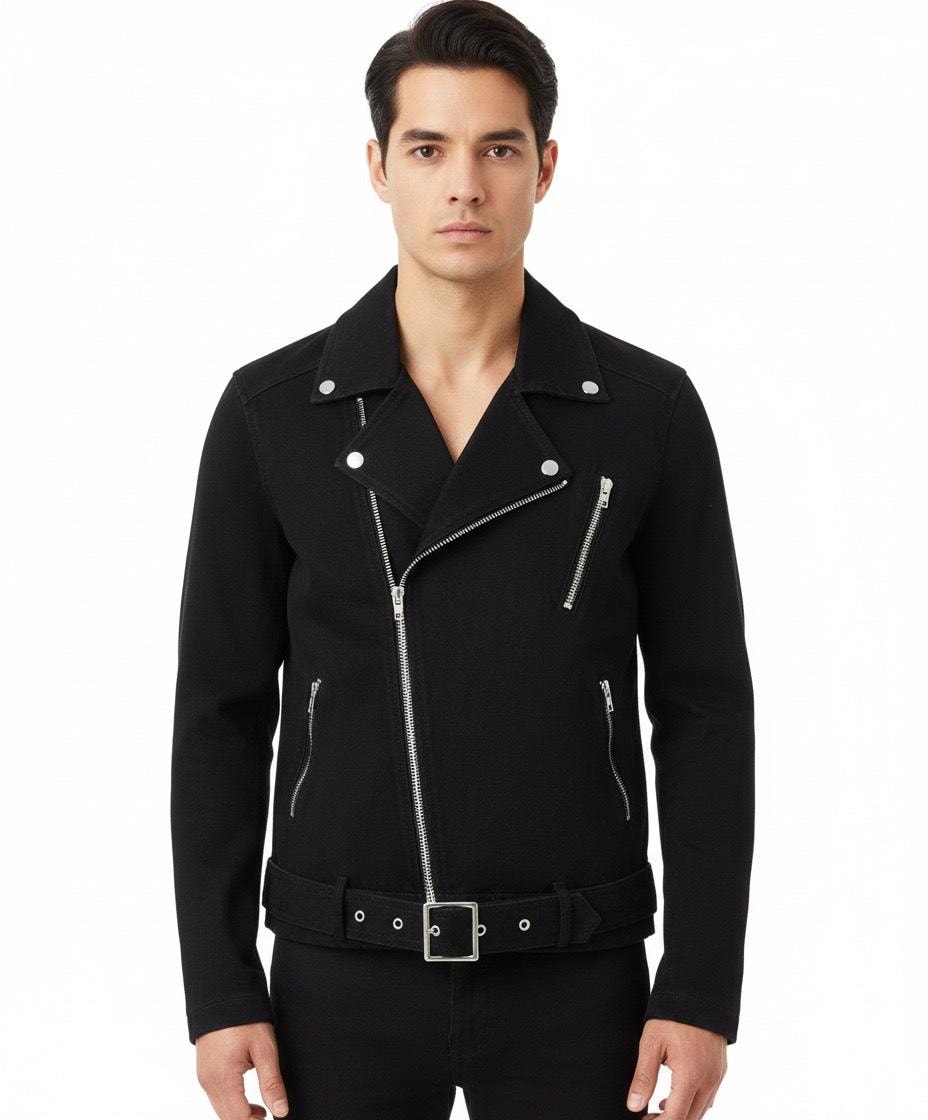 Men's Black Denim Biker Jean Jacket Classic Motorcycle Style Slim F...