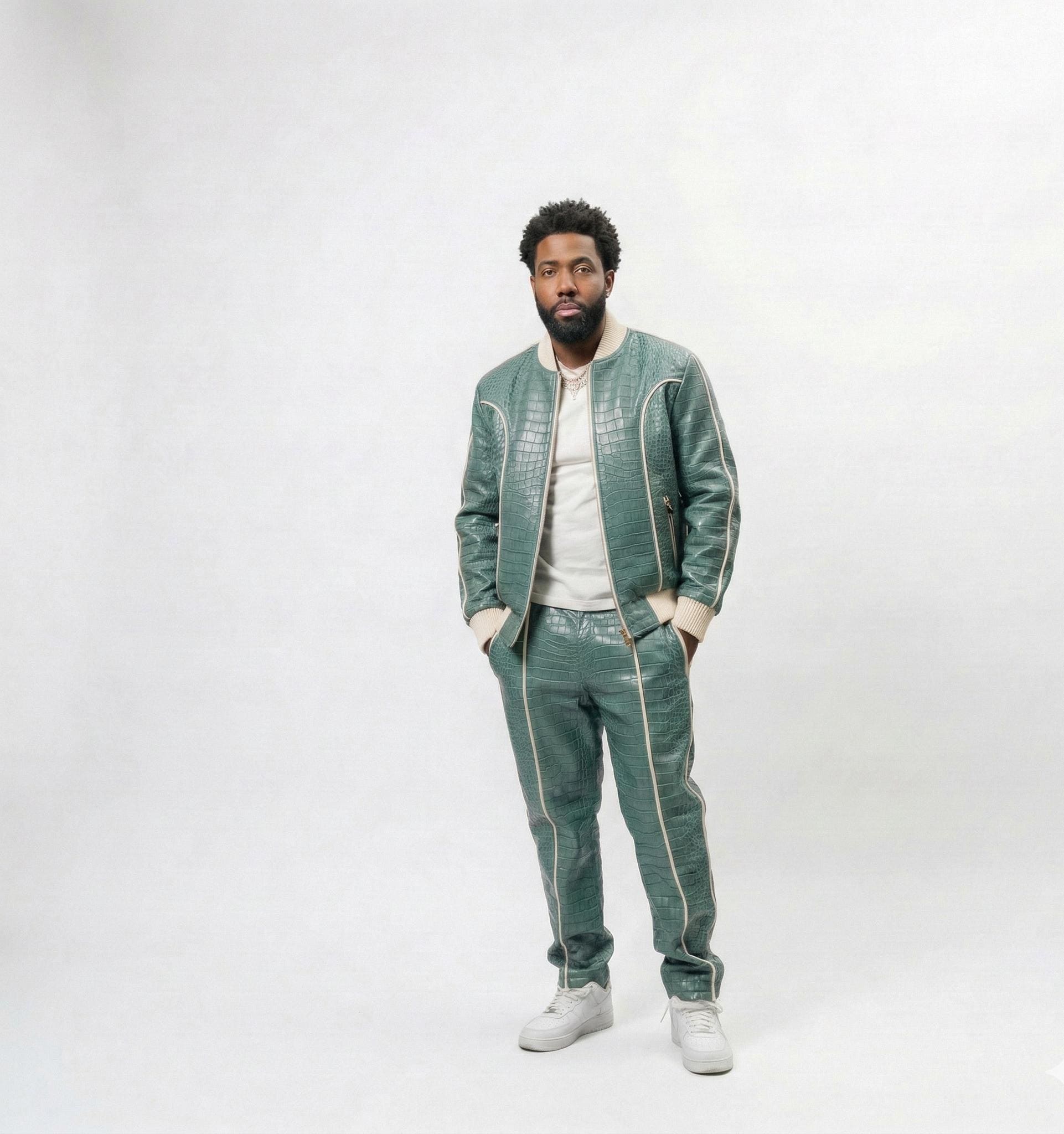 Men's Crocodile Embossed Leather Tracksuit Set, Designer Streetwear...