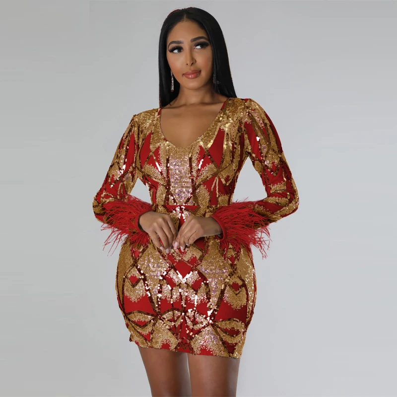 Party Women's Feather Long Sleeved V-neck Printed Sequin Tight Midi Dress 2024 Sexy and Fashionable ...