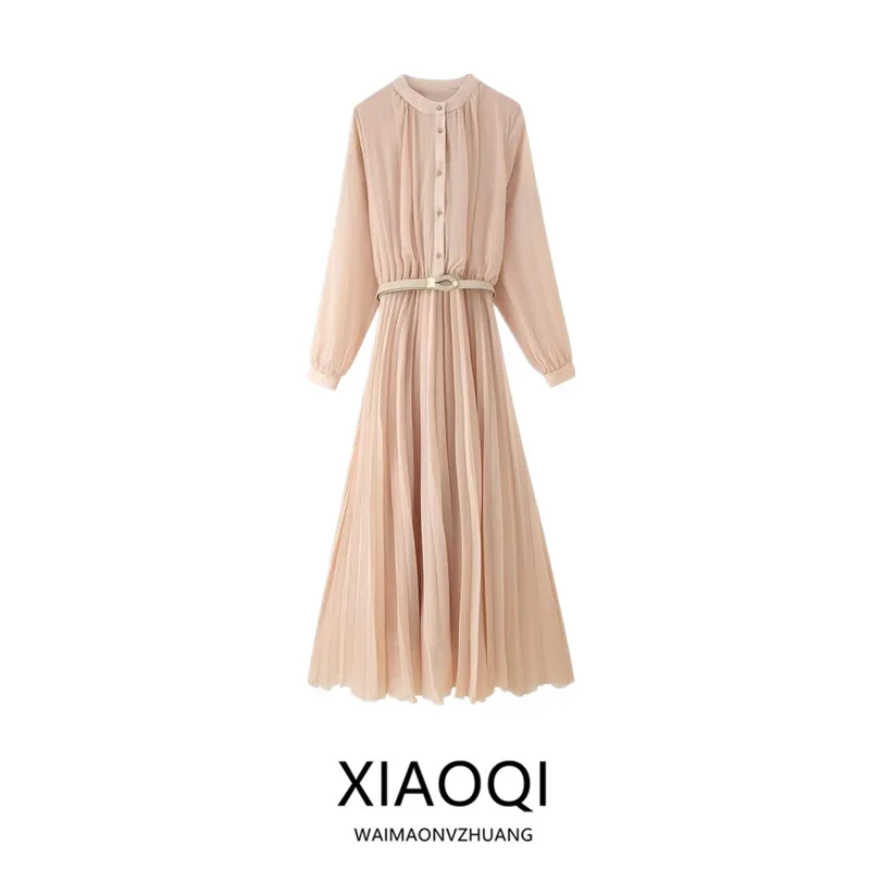 Elegant Long Midi Dress Women's Fashion Autumn 2025 New Style Versatile Belted Pleated Dress Ladies ...