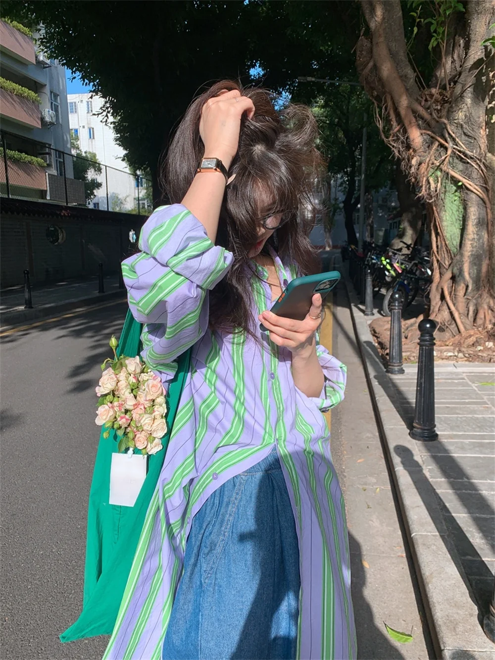 Women's Loose Large Size Long Sleeve Striped Shirt Dress Knee-Length Midi Cardigan Outerwear Spring ...