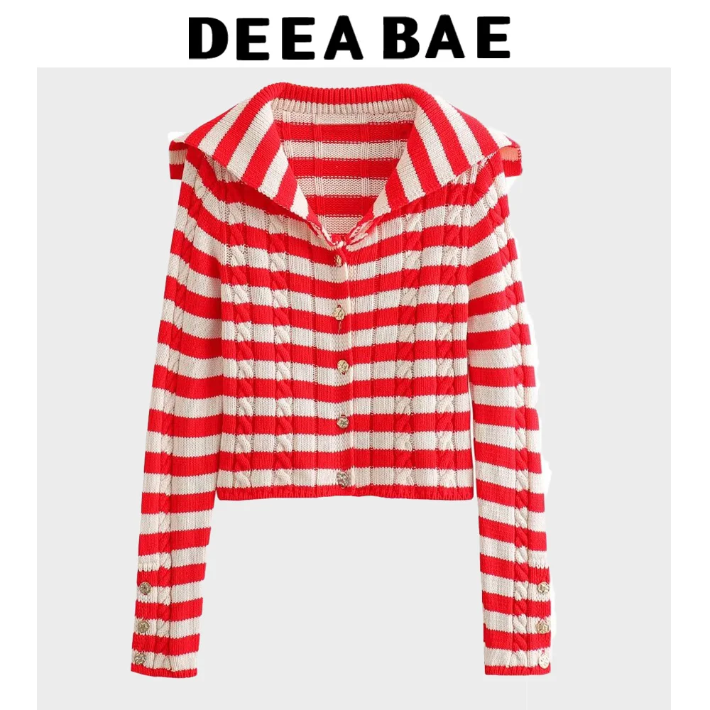 DEEABAE Spring Women's Wear Sweet Style Lapel Knitted Striped Sweater Fashionable And Versatile Eigh...