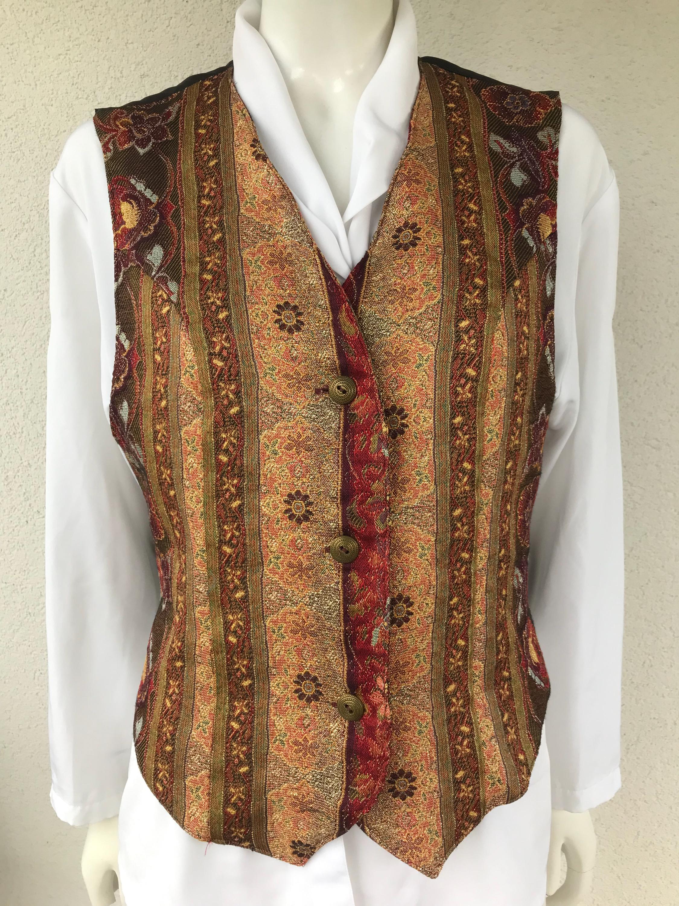 Shiny, festive vest in burgundy, brown, gold shades. Fastens with copper-colored metal buttons. V-ne...