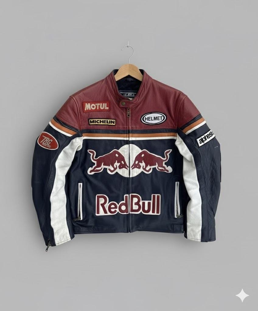 This Redbull motorsport-inspired racing jacket brings a bold vintage racing look to everyday streetw...