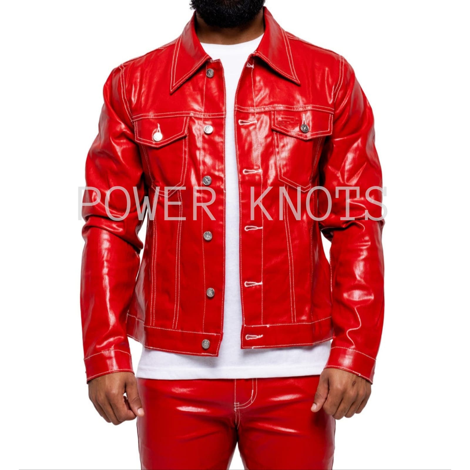 Men's Shiny Red Patent Denim Style Leather Shirt, Men's Red Leather...