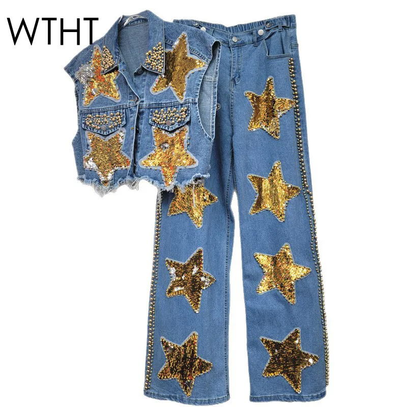 WTHT Vintage Women's Heavy Industy Sequins Lapel Denim Vest Fashion 2025 Summer Beads Straight Wide ...