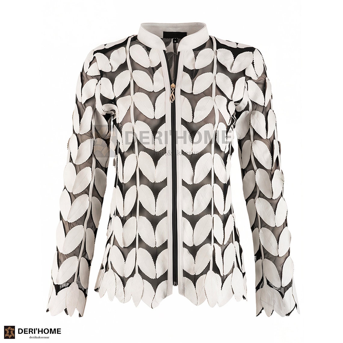 This jacket is embellished with hand cut leather leafs. Zipping up to a mandarin collar, this origin...