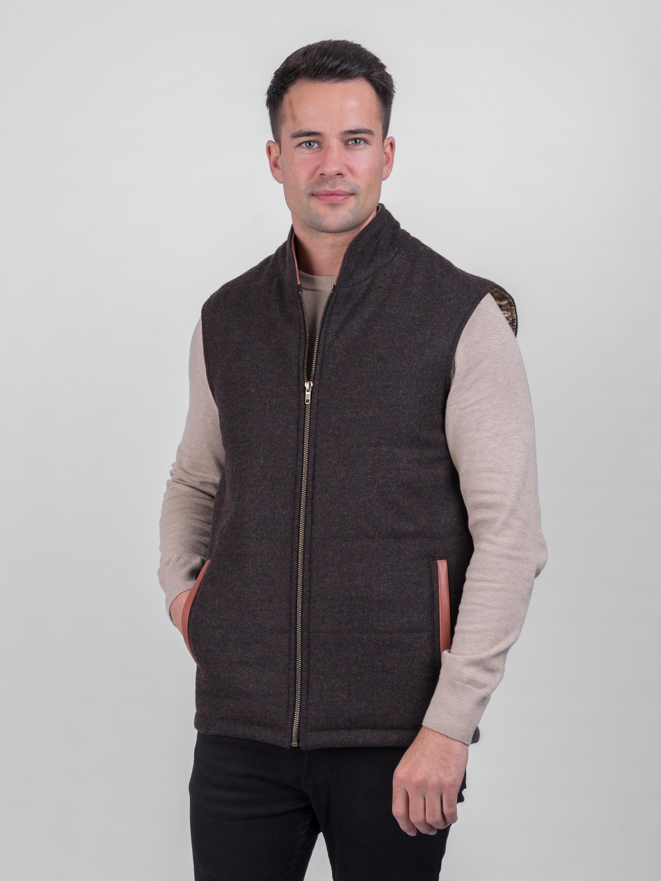 Mens Peat Tweed Bodywarmer with Leather Trims | Irish Wool Gilet | ...