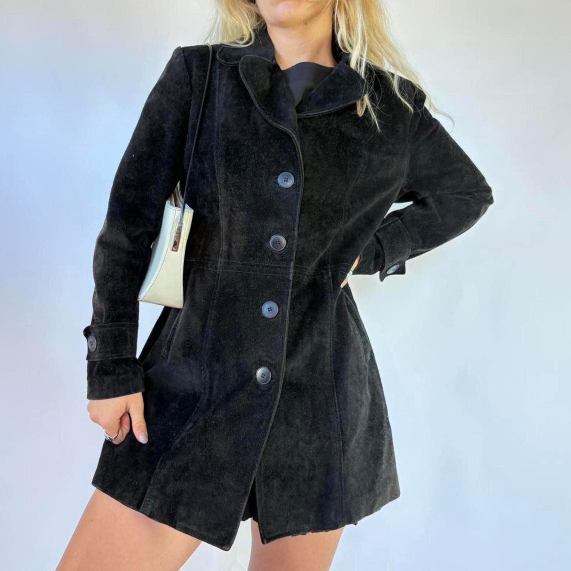 Women's Black Suede Coat - Vintage Long Suede Leather Jacket - 70s Button Up Suede Trench Coat - Sho...