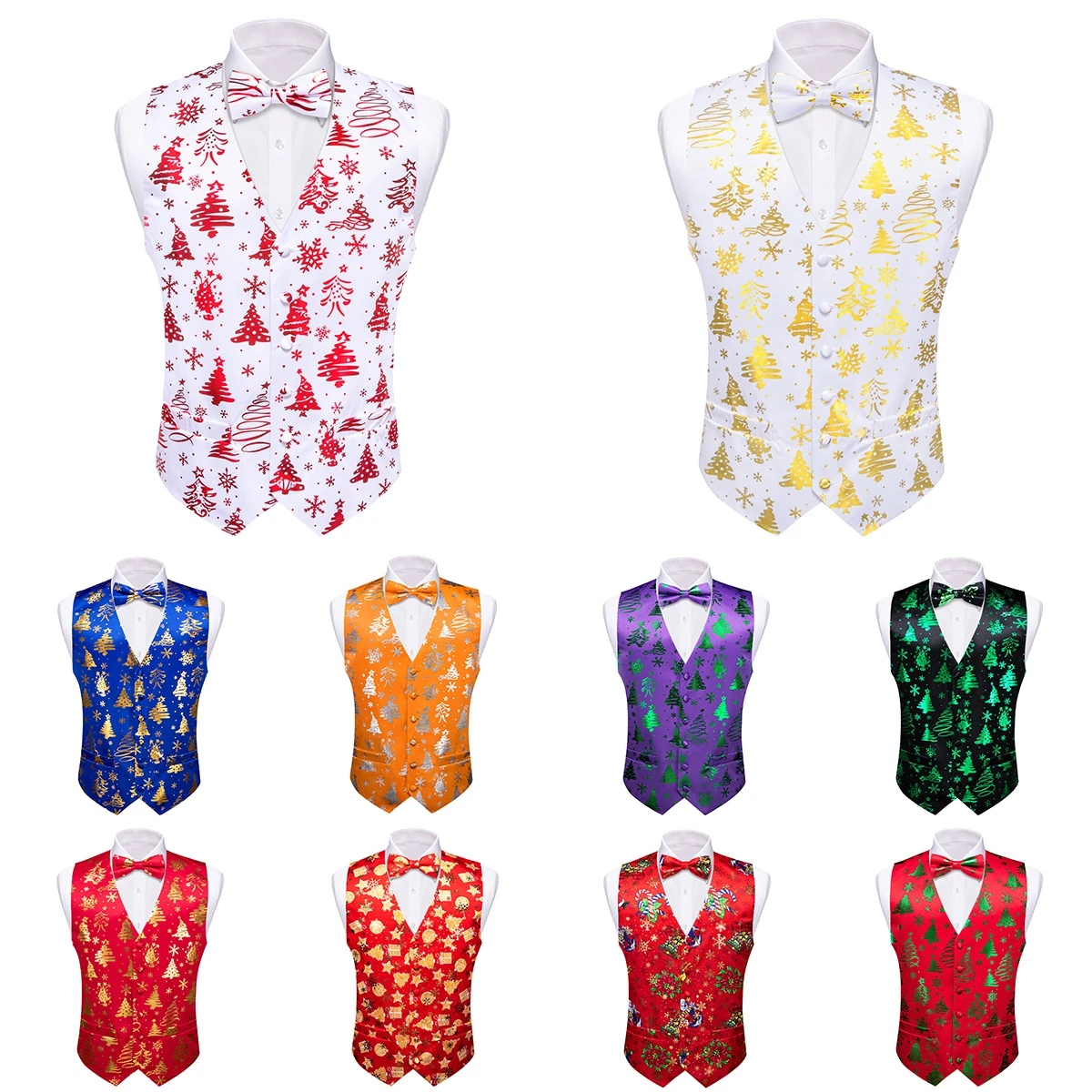 Christmas Mens Vest Silk White Red Blue Green Snowflake Gift XmasTrees Santa Claus Waistcoat Bowtie ...