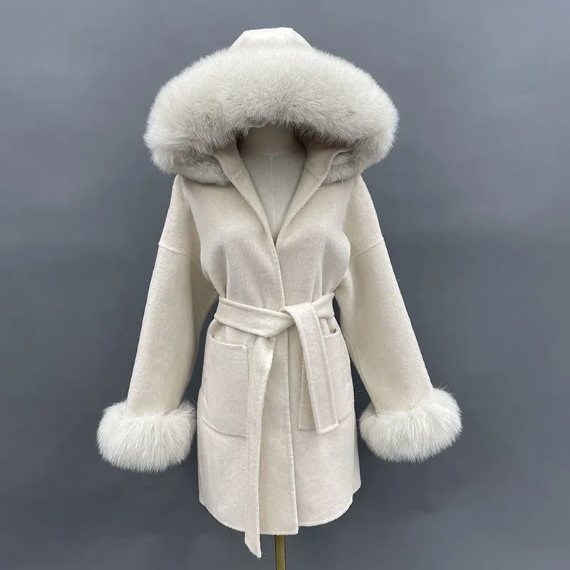 MISSJANEFUR Wool Coat with Real Fox Fur Collar Cuff Women Fashion Belted Cashmere Coats Warm Winter ...