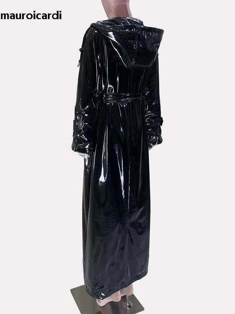 Mauroicardi Spring Autumn Cool Extra Long Shiny Reflective Waterproof Thin Black Soft Patent Faux Le...