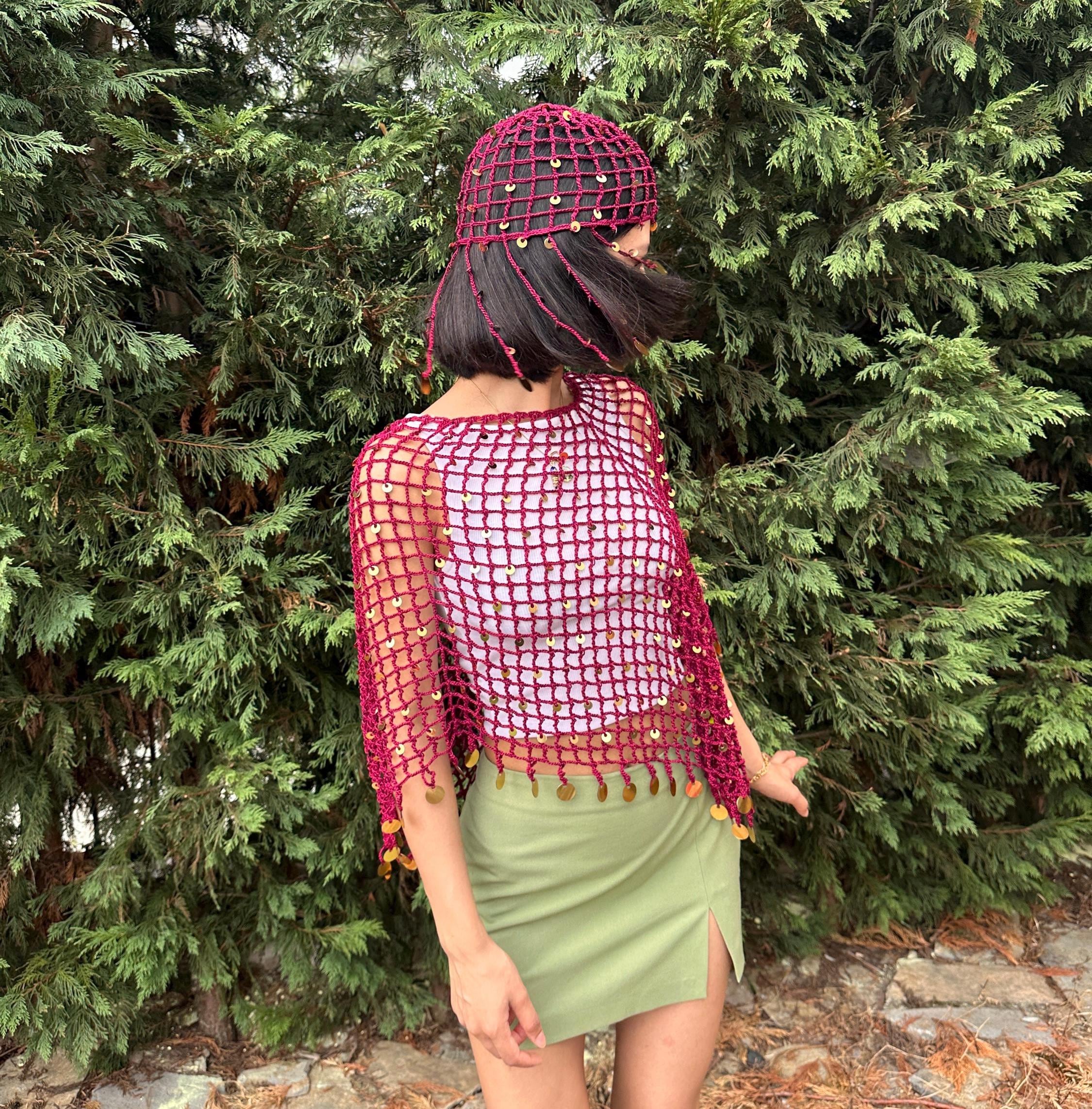 Handmade Mesh Crochet Poncho - Burgundy / Claret Red Gold Sequin Tr...
