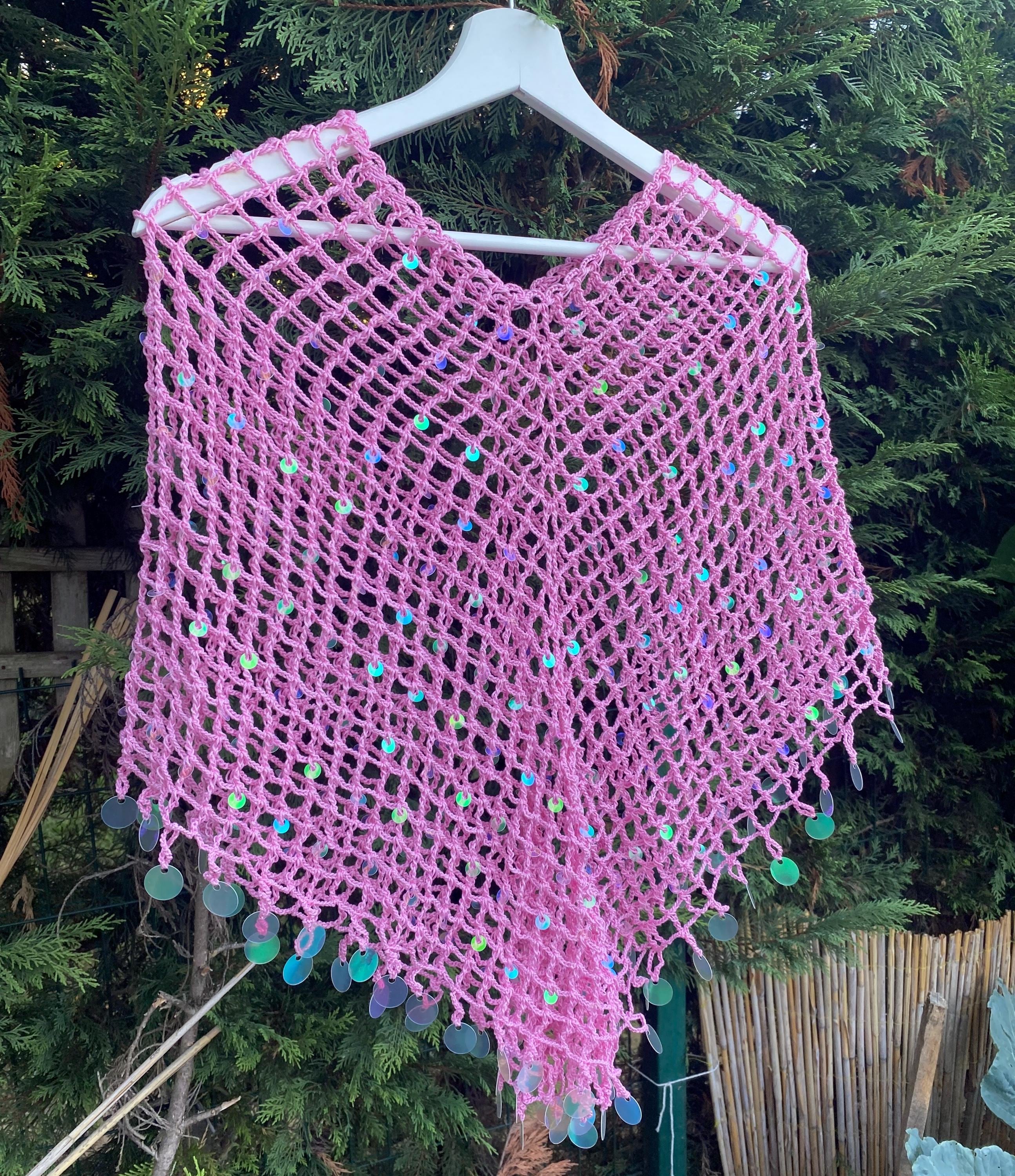 Handmade Mesh Crochet Poncho - Pink Iridescent Sequin Triangle Wrap...
