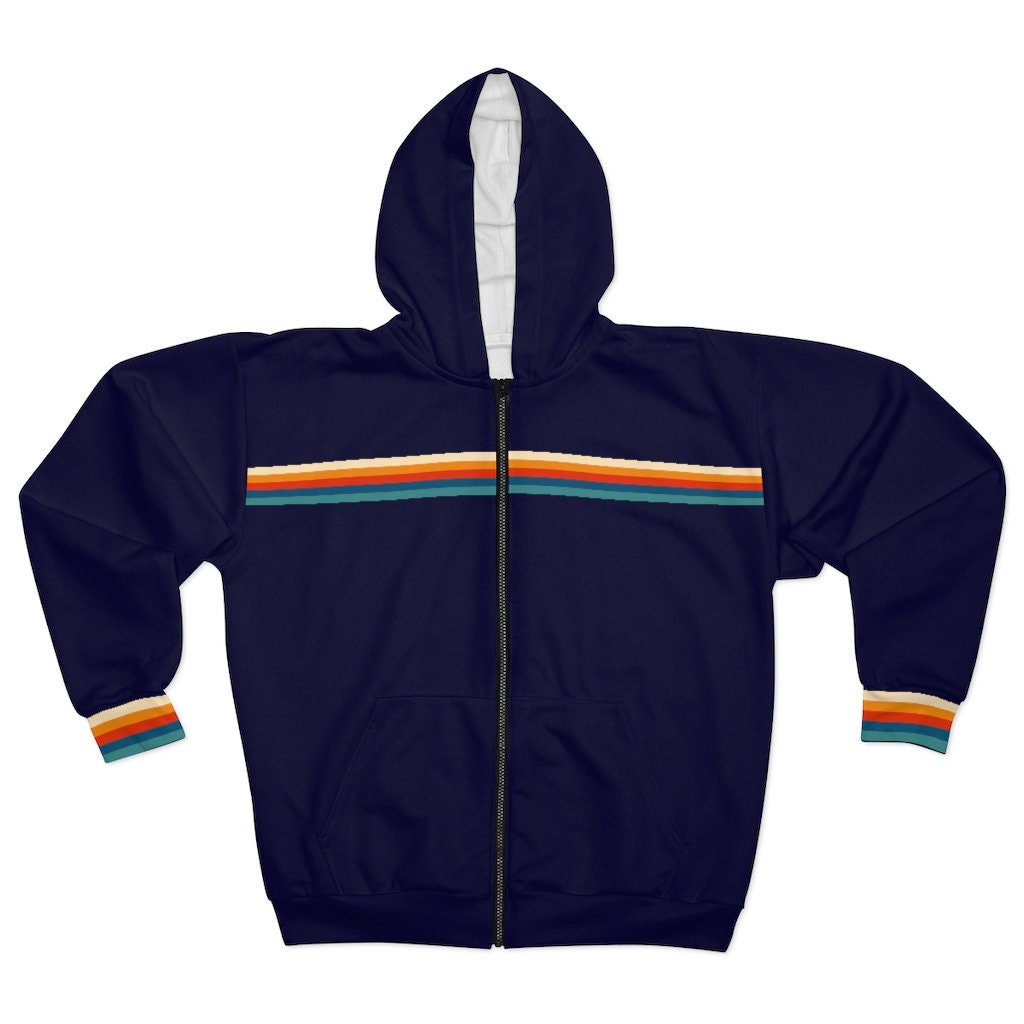70s Retro Stripe Full Zip Up Hoodie, Navy Vintage Rainbow Striped Z...