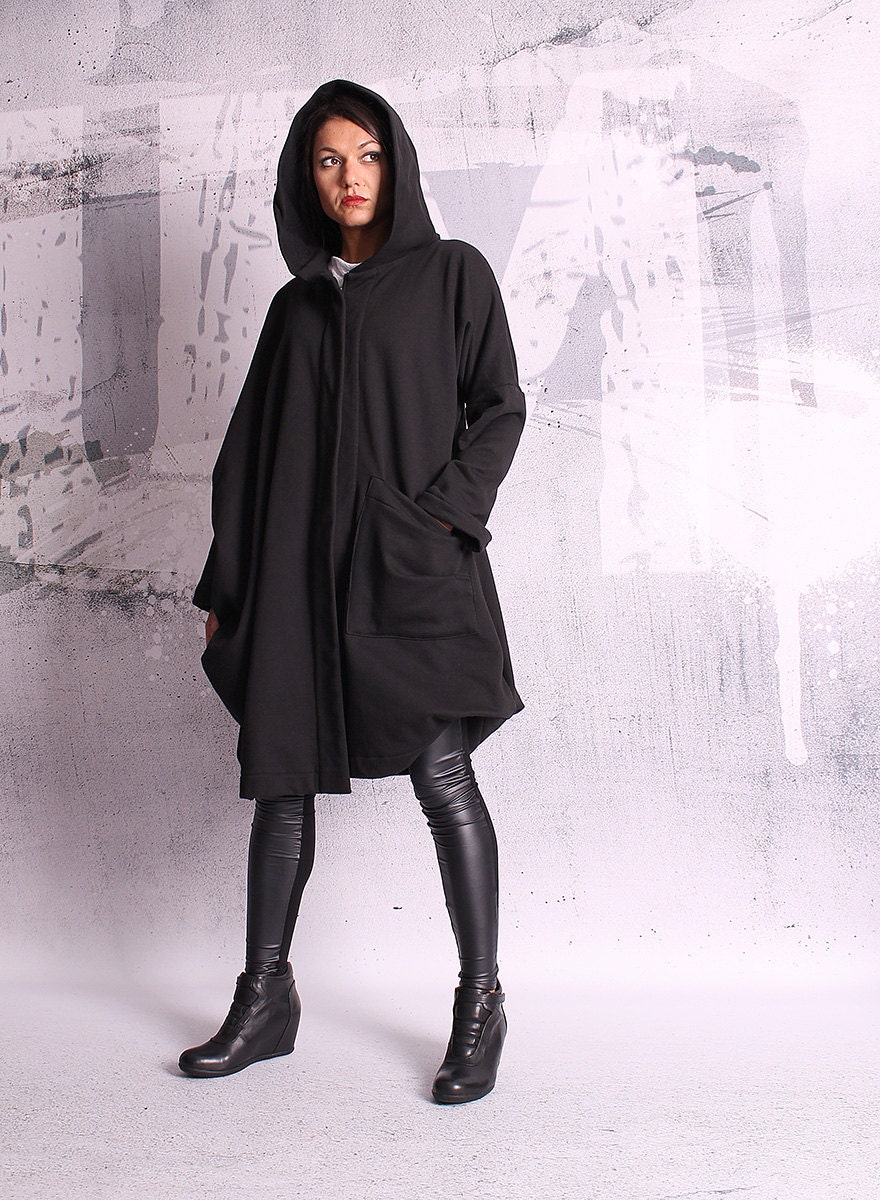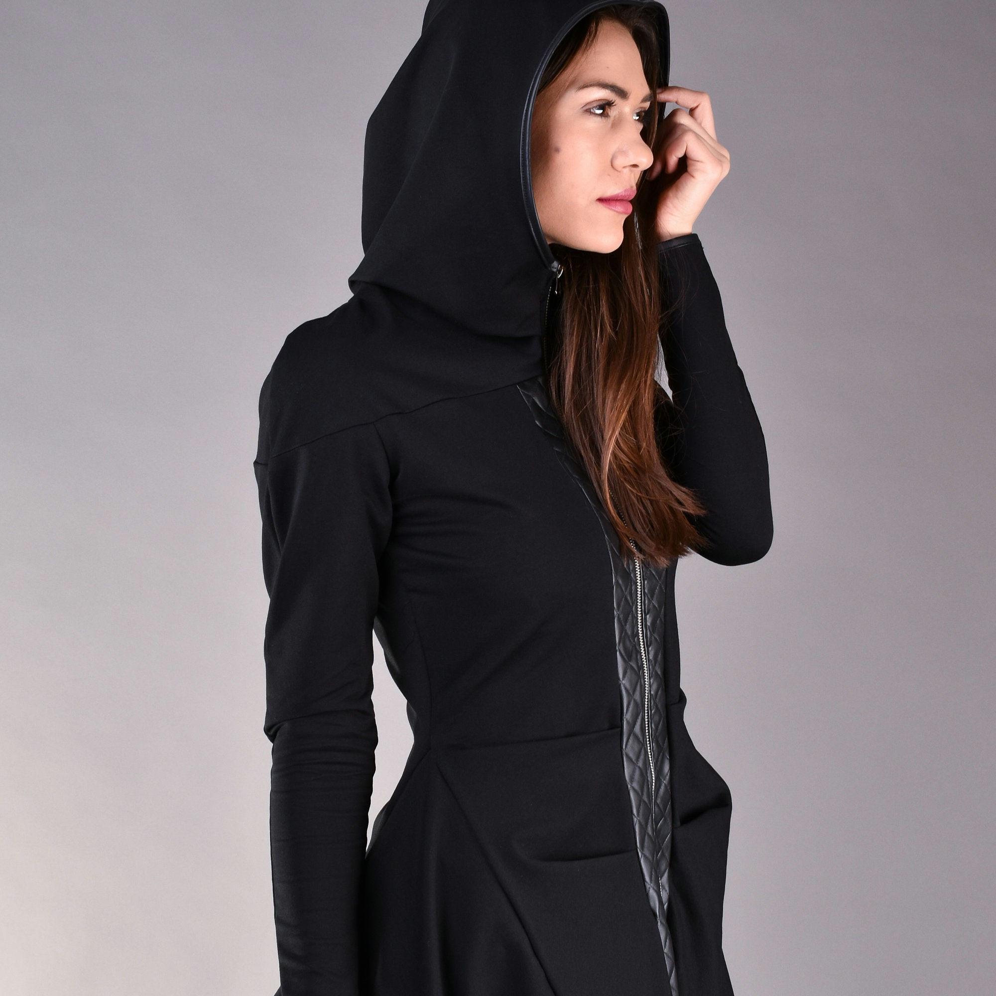 "Extravagant asymmetric black jacket with zip and hoodie. If you prefer different length of the...