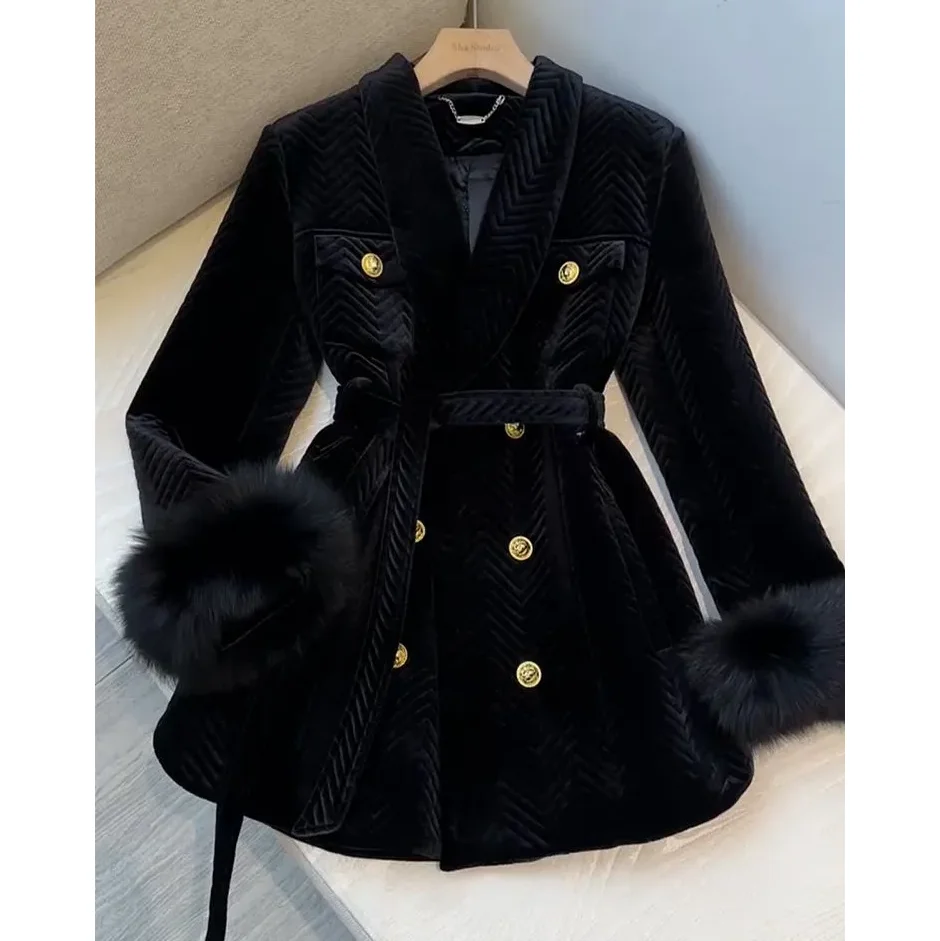 Gold Velvet Mid-Length Warm Jacket Women's Overcoat Unique Super Go...