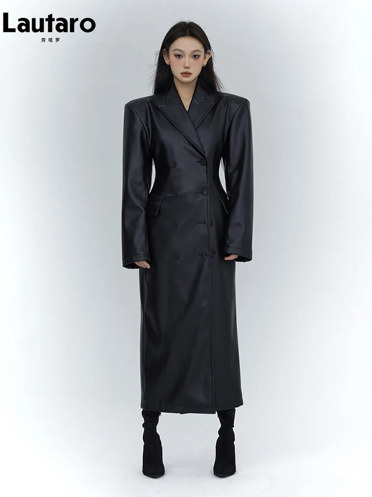 Lautaro Spring Autumn Long Black Fitted Soft Pu Leather Trench Coat for Women with Shoulder Pads Lux...