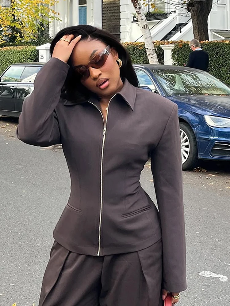 Casual Women's Waist-cinching Jacket Shoulder Pads Lapel Zipper Full Sleeve Pockets Solid Coats 2026...