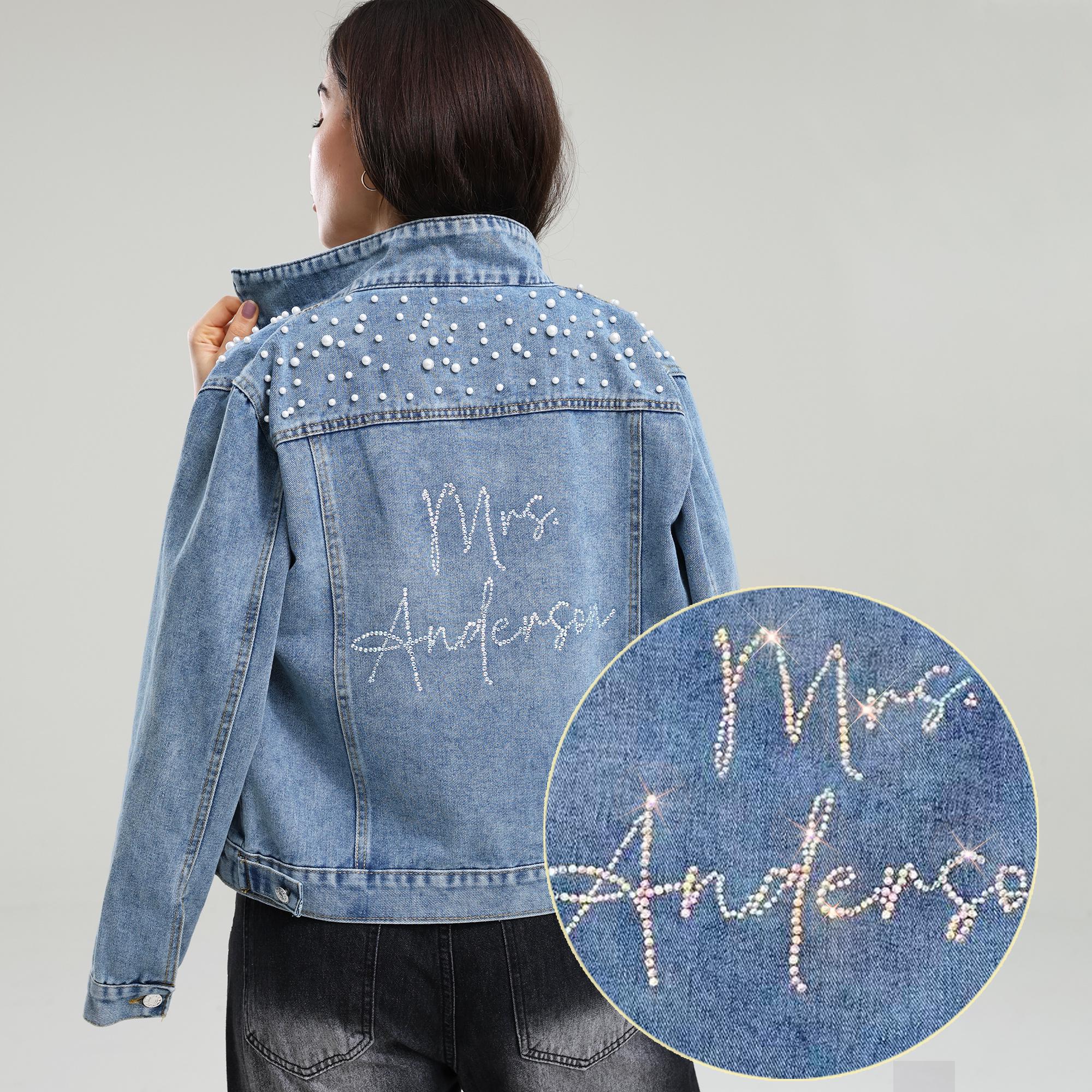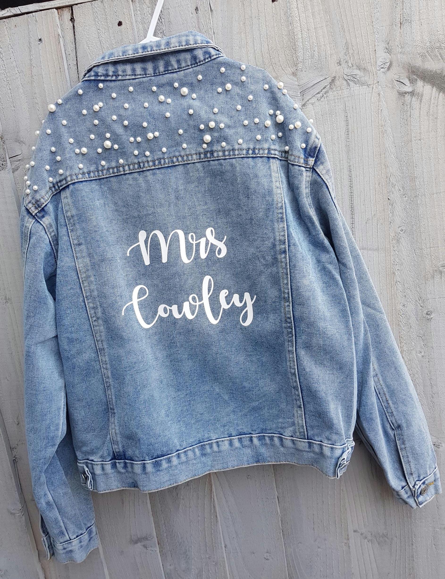 Rhinestone Denim Jacket, Custom Pearl Bride Denim Jacket, Wifey Jac...