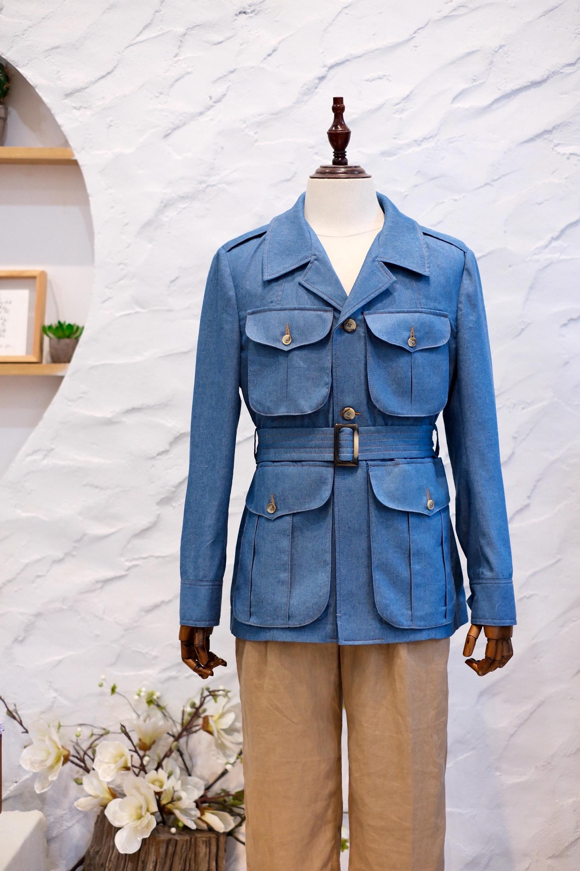 Handmade Denim Jacket Men Denim Safari Jacket Men With Belt Denim W...