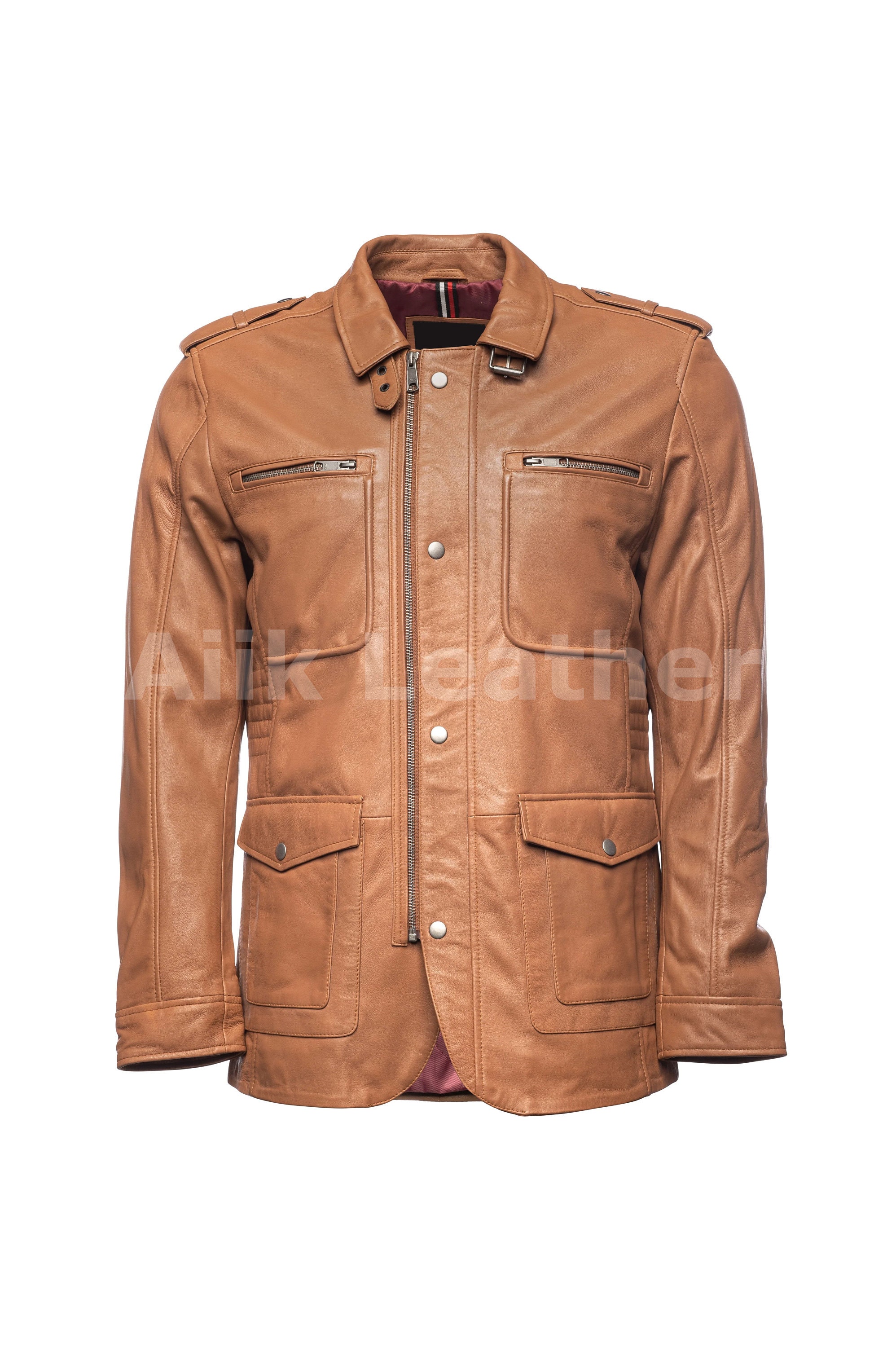 Vintage Safari Leather Coat Tan Mens Casual Panther Ten Safari Benjamin Belt Military Blazer Style F...