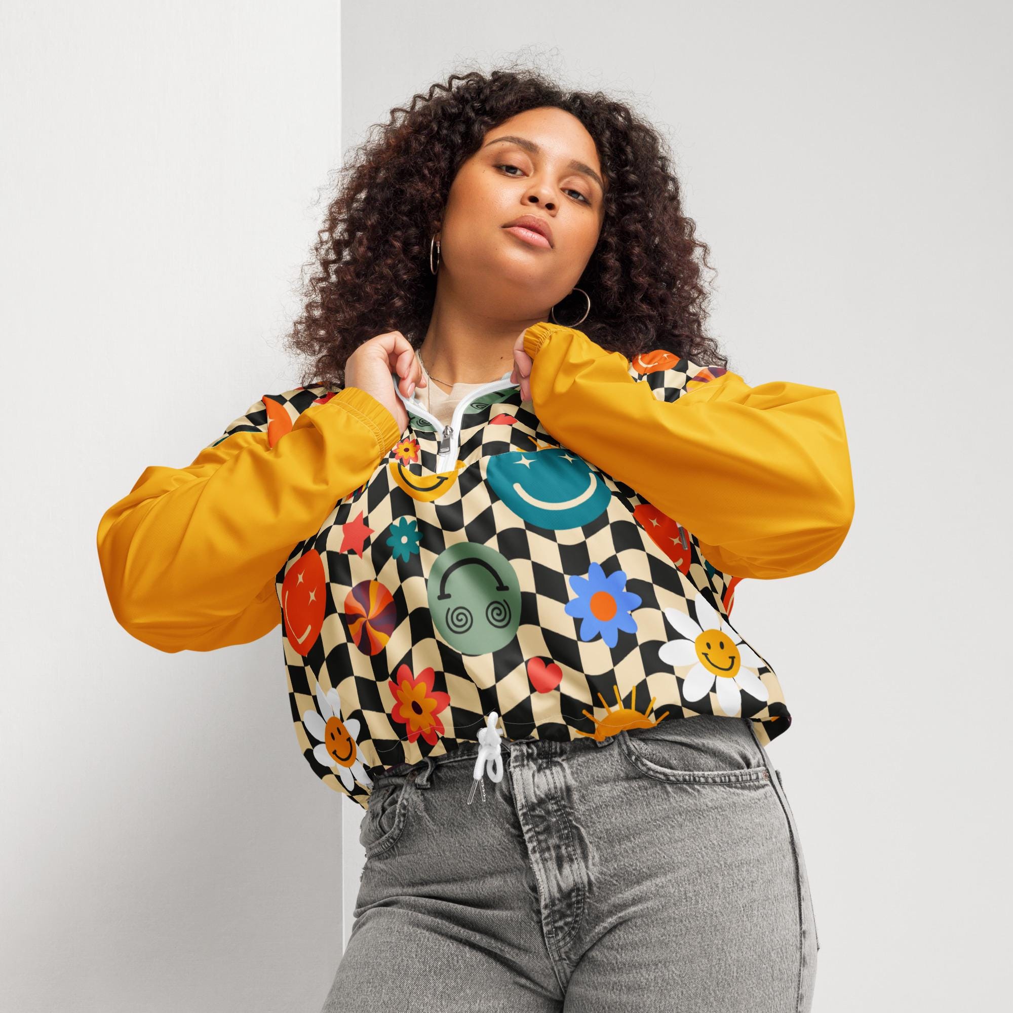 Retro Smiley Face Windbreaker, Yellow Checkered Cropped Jacket, Wom...