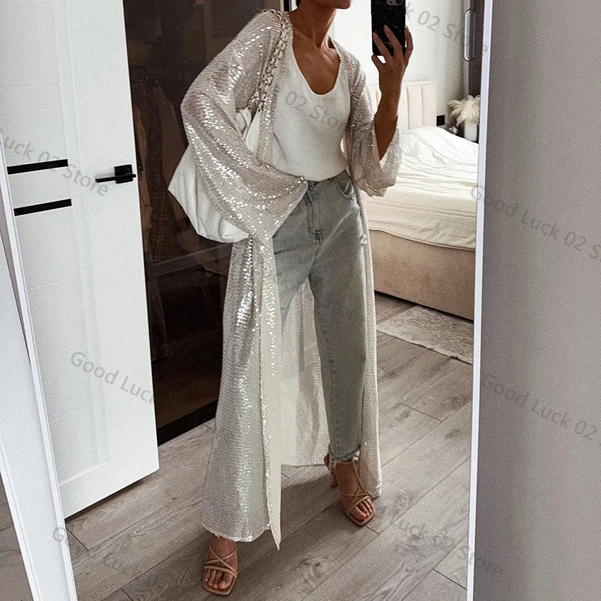 2025 Casual White Woven Sequin Trench Coat Woman Autumn Long Sleeve Collarless Trench Woman Sashes O...