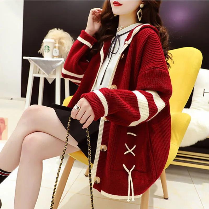 Korean Female Hooded Knitting Cardigan Jacket Retro Lazy Wind Women Loose Fit Sweater Outerwear Spri...
