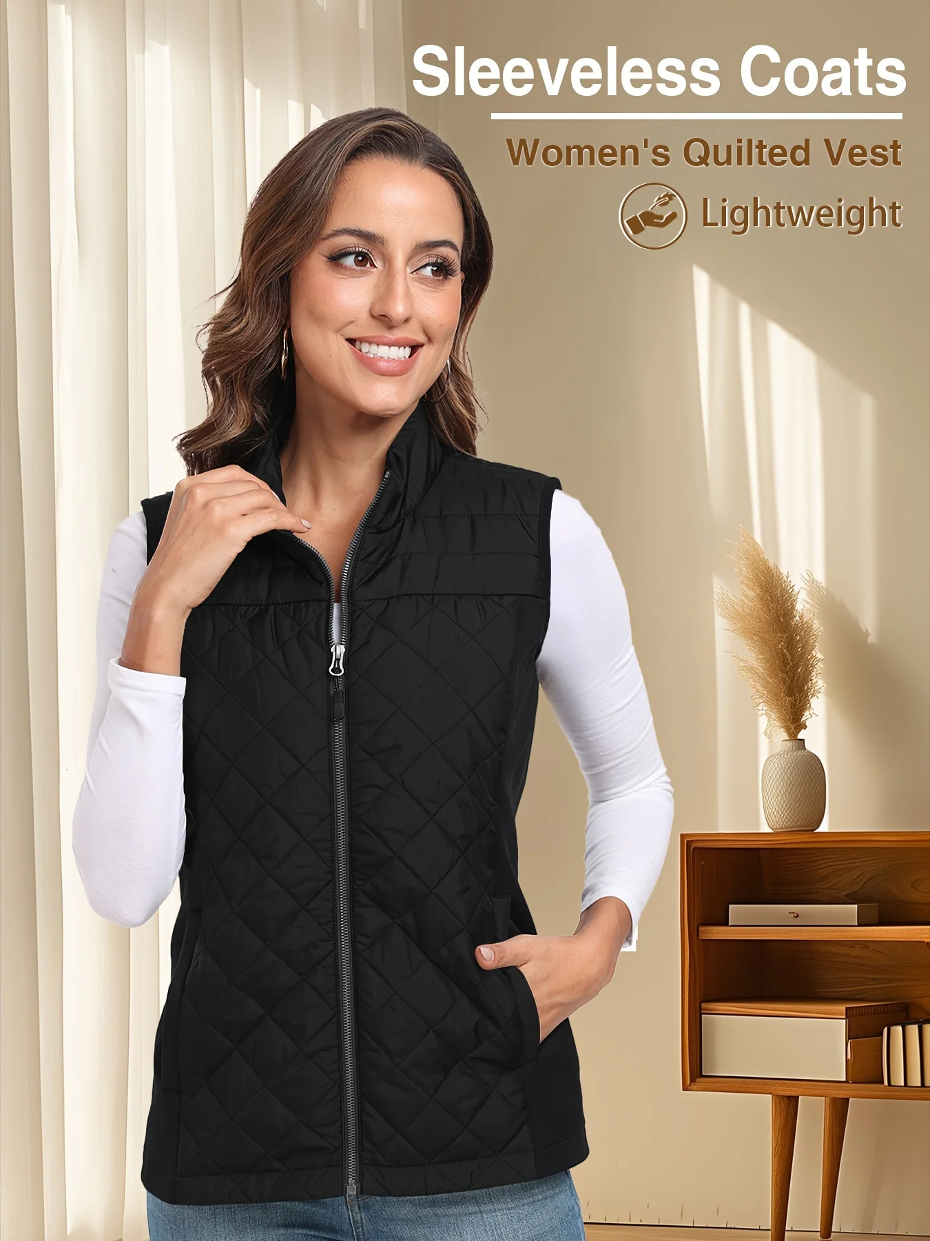 Womens Vest Tops Sleeveless Quilted Outerwear Jackets Stand Collar Zip up Lightweight Vests Spring F...