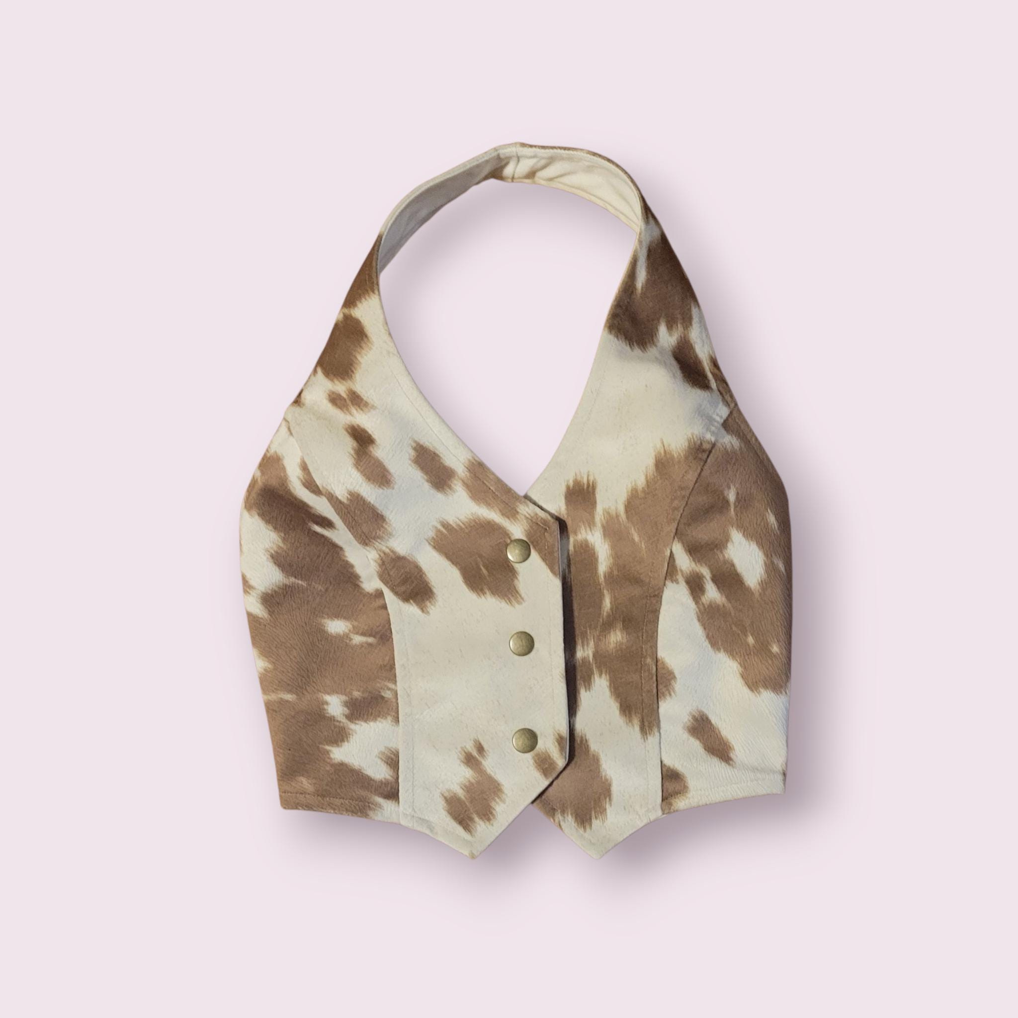 cow vest fuax cow print feels real great faux halter vest 3 snap front for security laces up in back...