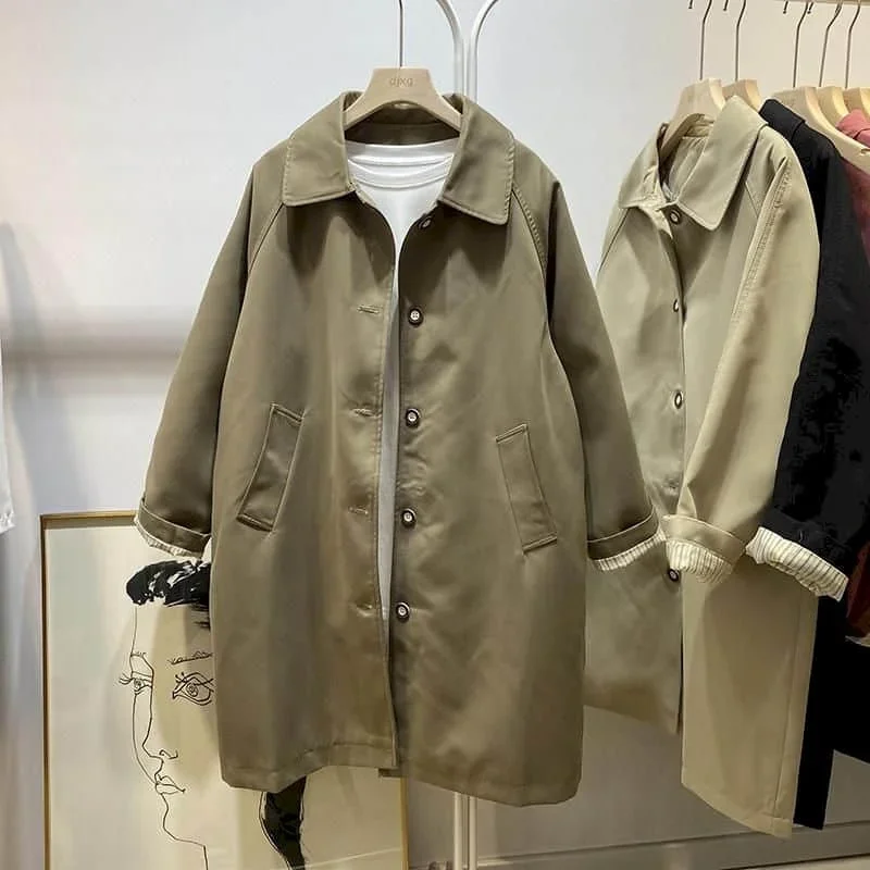 Solid Trench for Women Long Sleeve Casual Korean Style Workwear Mid Length Single Breasted Oversized...