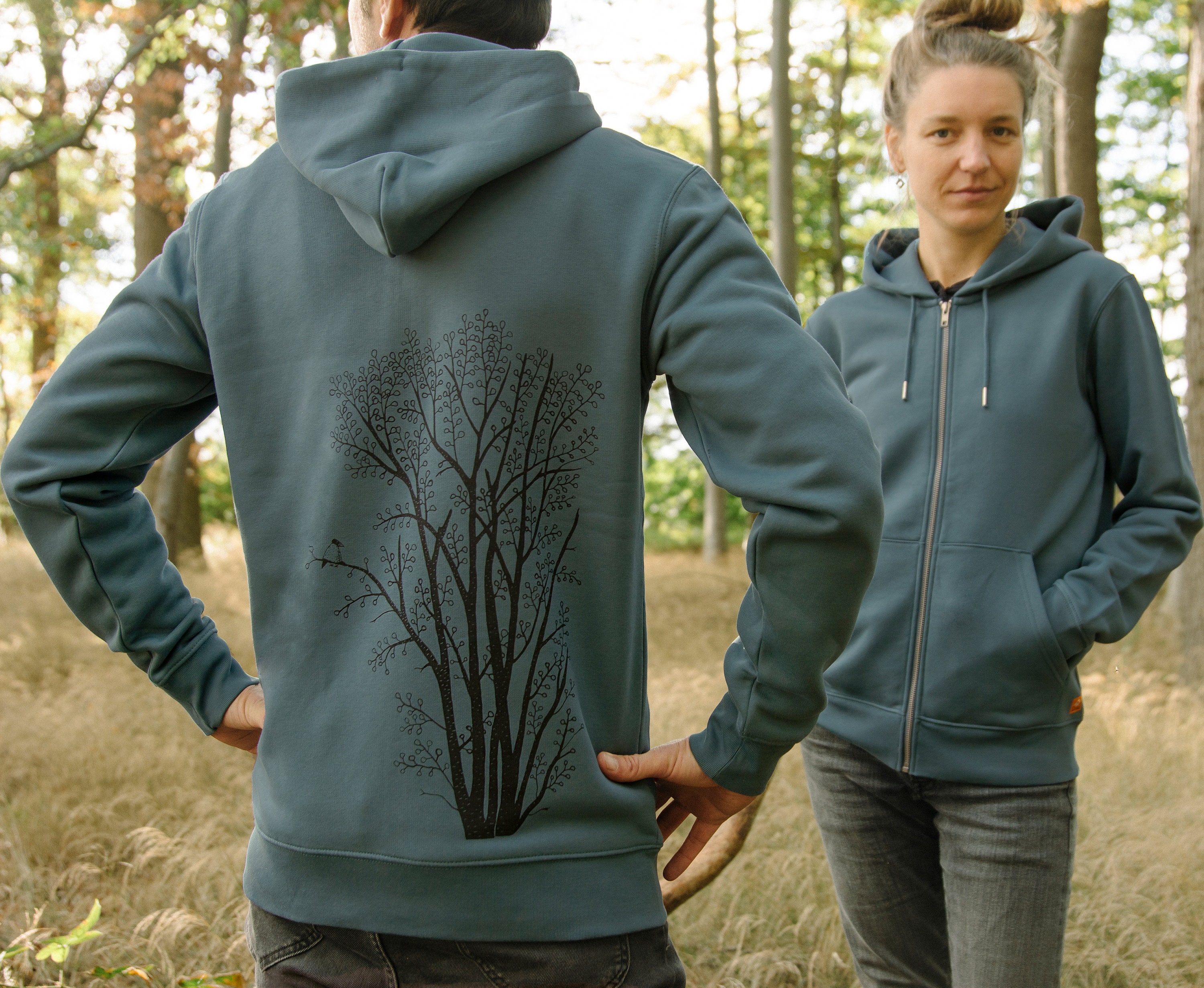 Hand-printed women's zip hoodie in petrol blue / Organic women's sw...