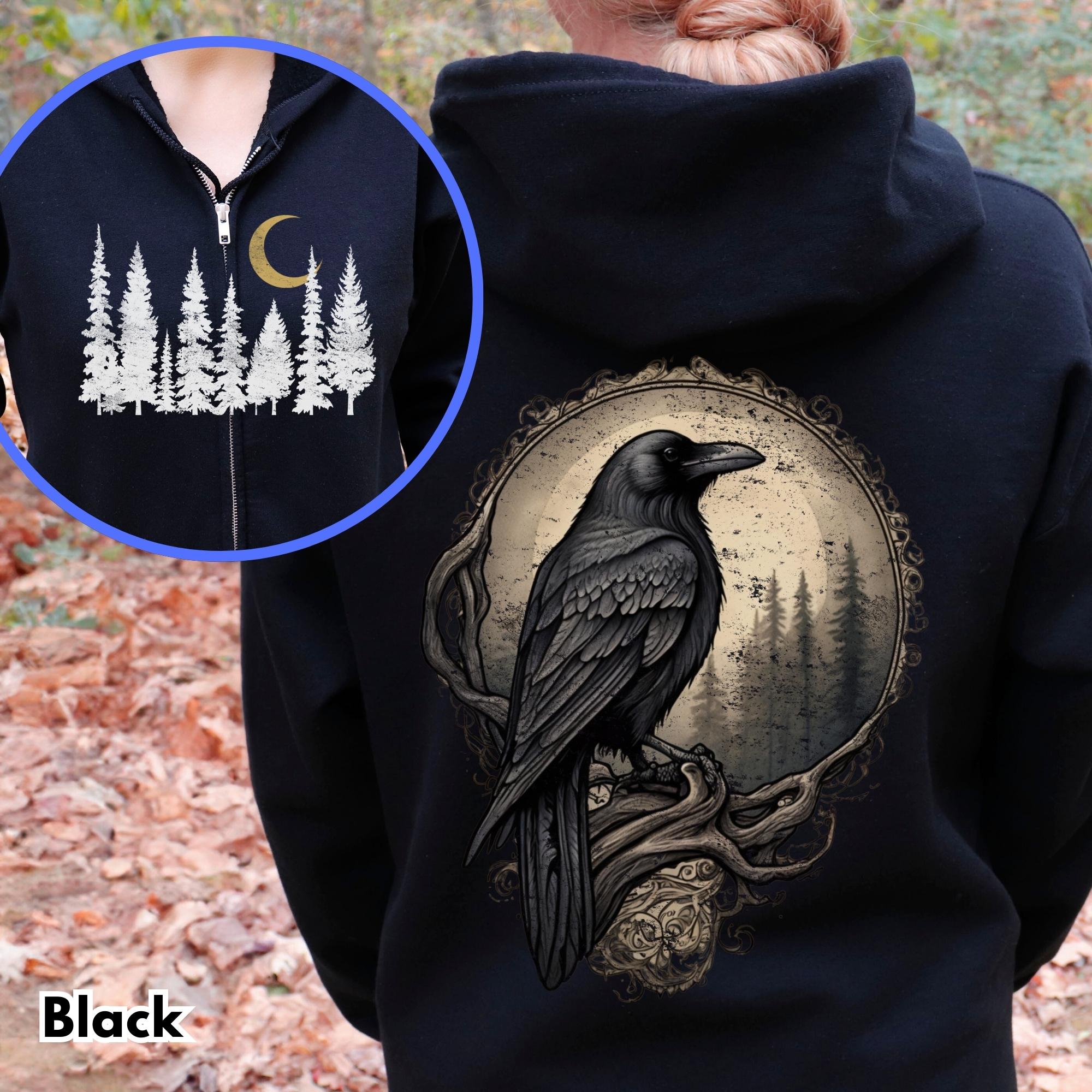 Gothic Raven Zip Hoodie, Dark Forest Zip Up Hoodie, Occult Graphic ...