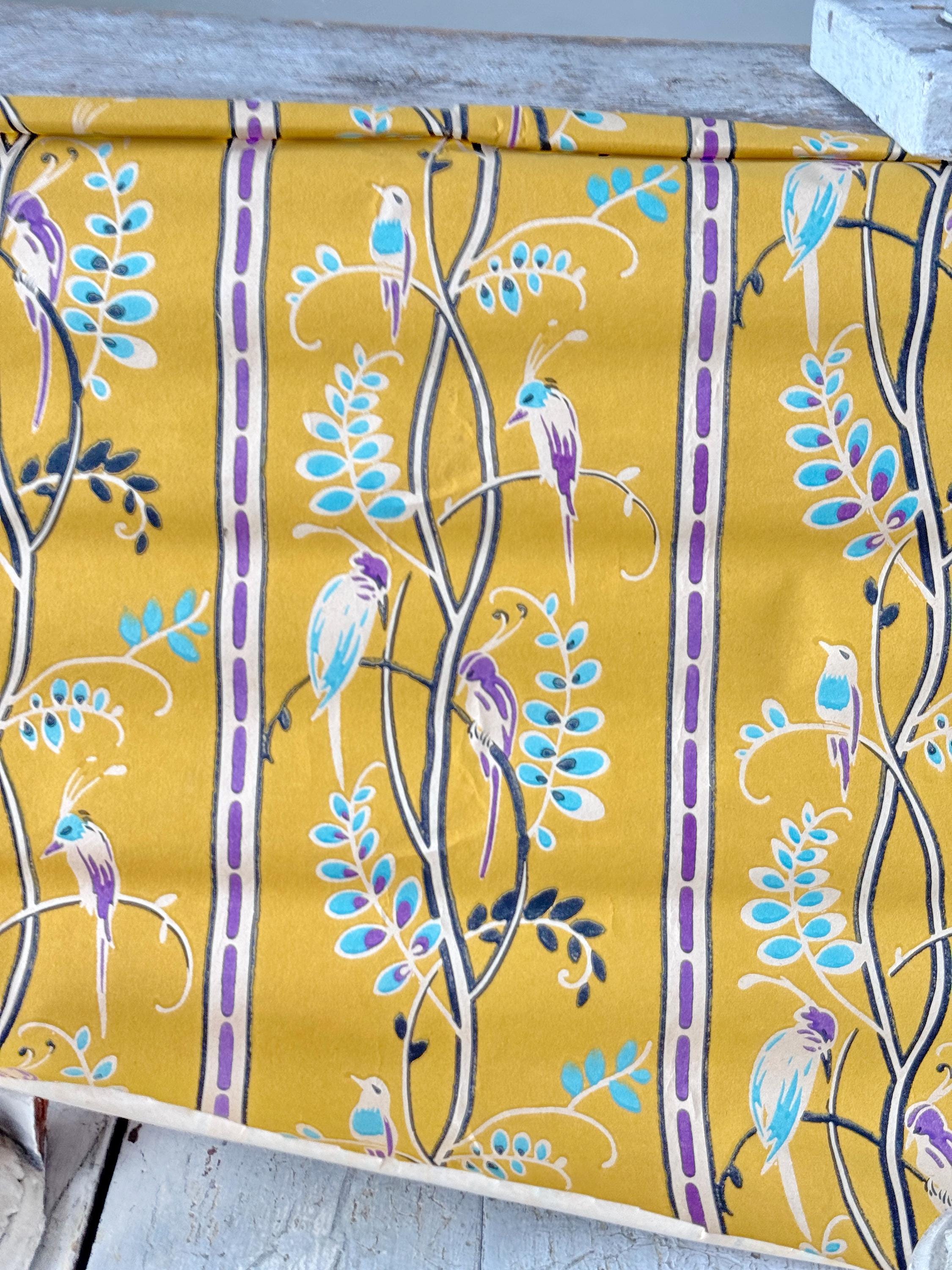 19 inches 1920 Yellow purple teal bird French wallpaper Vintage Ant...