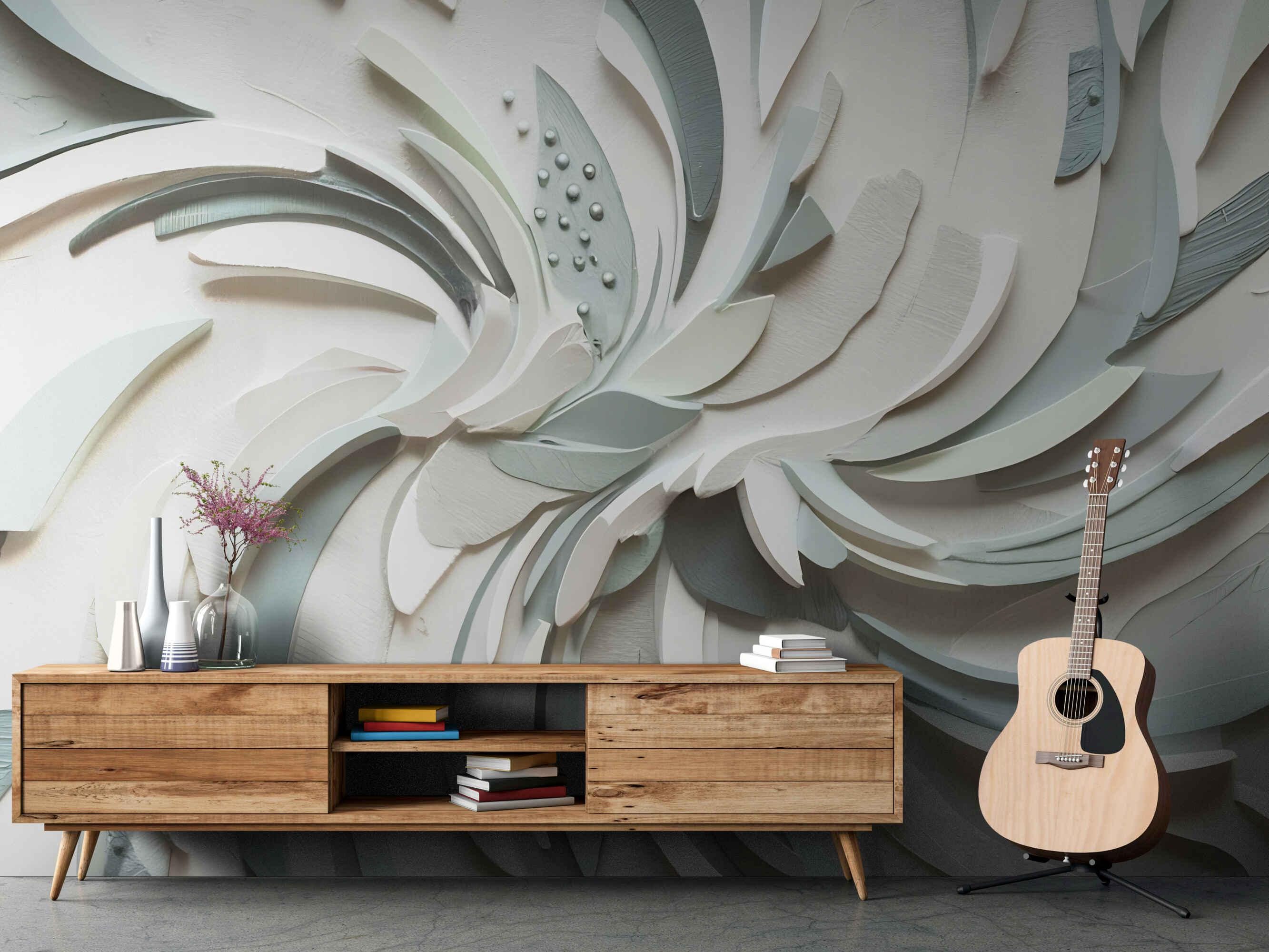 A neutral 3D abstract wall mural featuring sculpted, layered shapes in soft beige and gray tones. Pe...