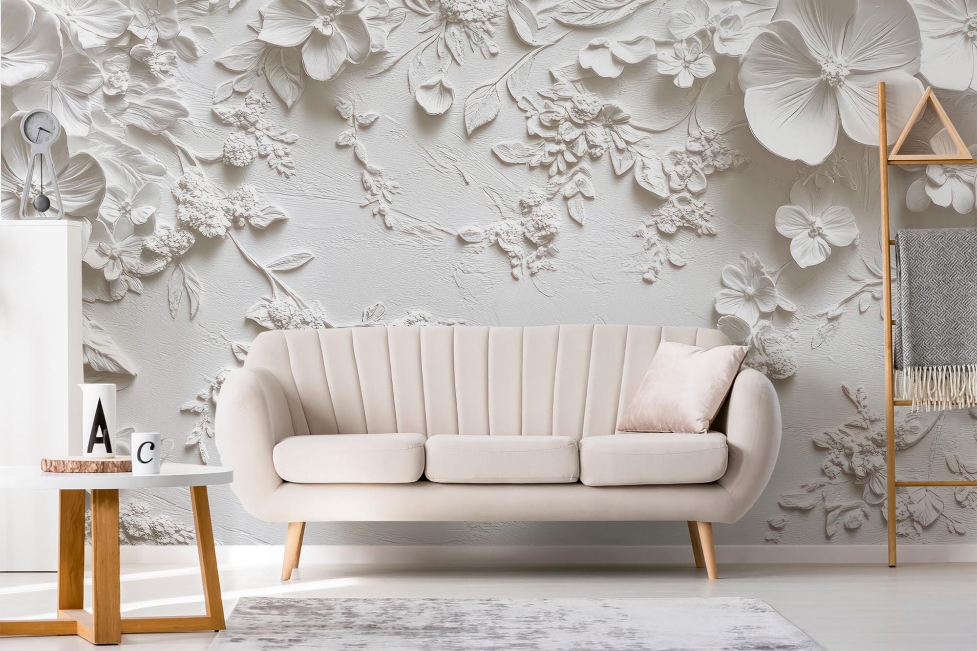 3D Floral Bloom wallpaper features an elegant sculpted floral design in soft matte white, with embos...
