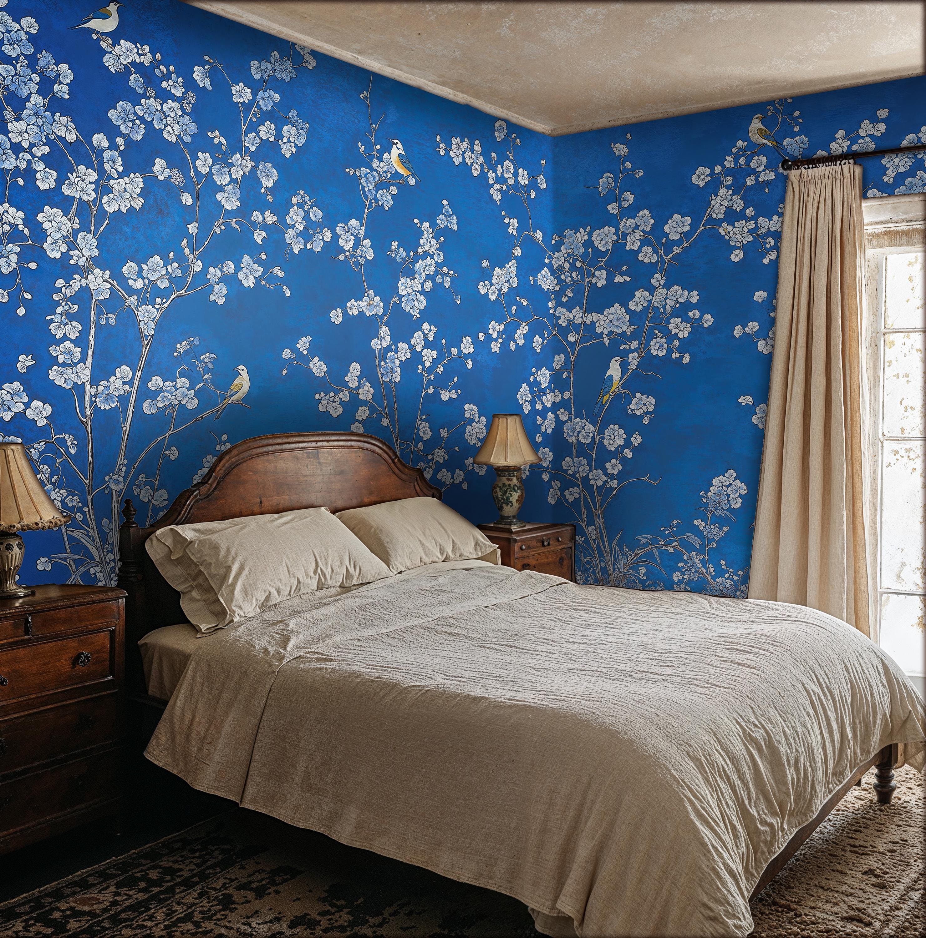 Elevate your interiors with this blue chinoiserie wallpaper with birds, a perfect blend of elegance ...