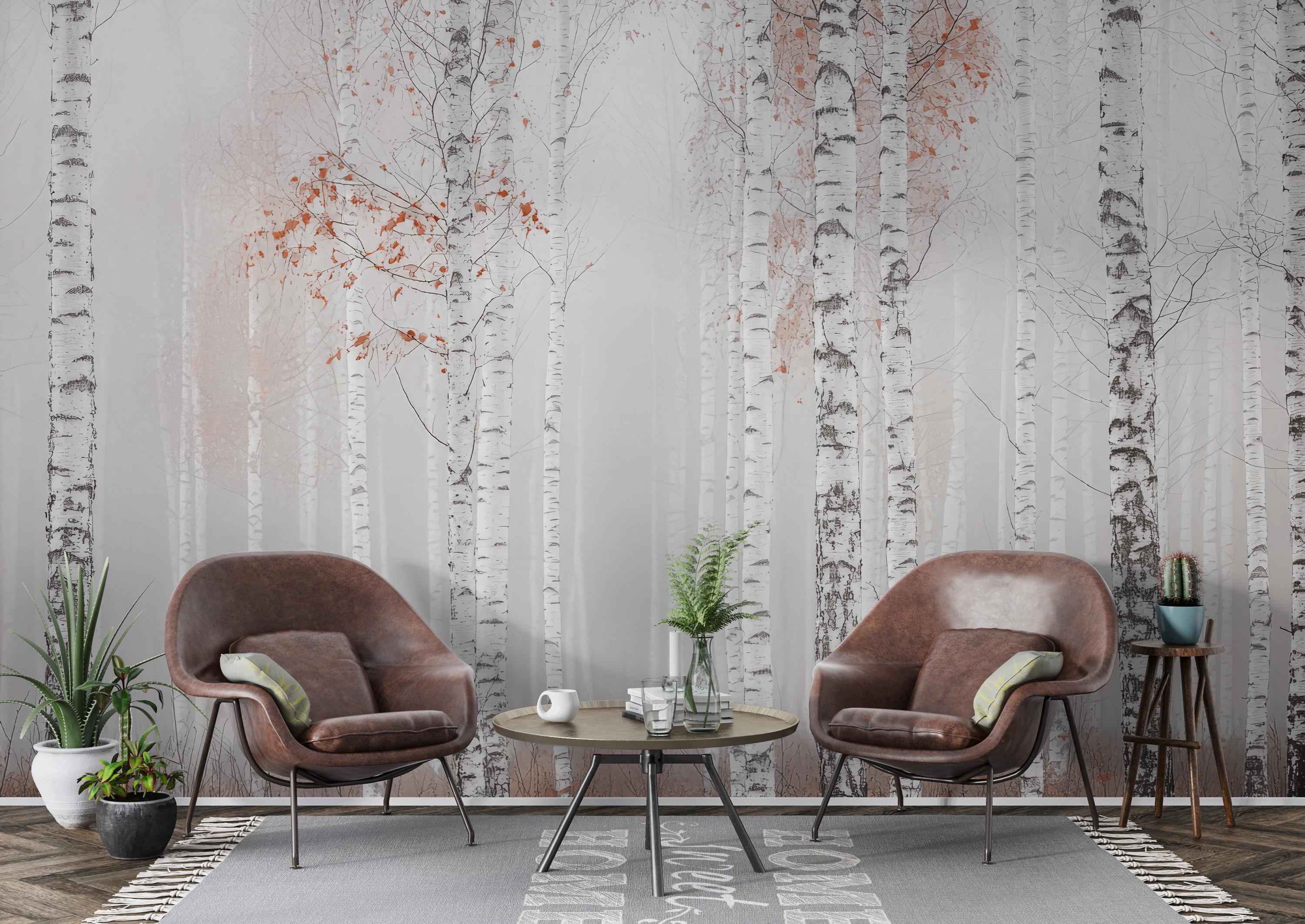 Transform your space with this stunning birch tree forest wallpaper featuring delicate pink leaves. ...