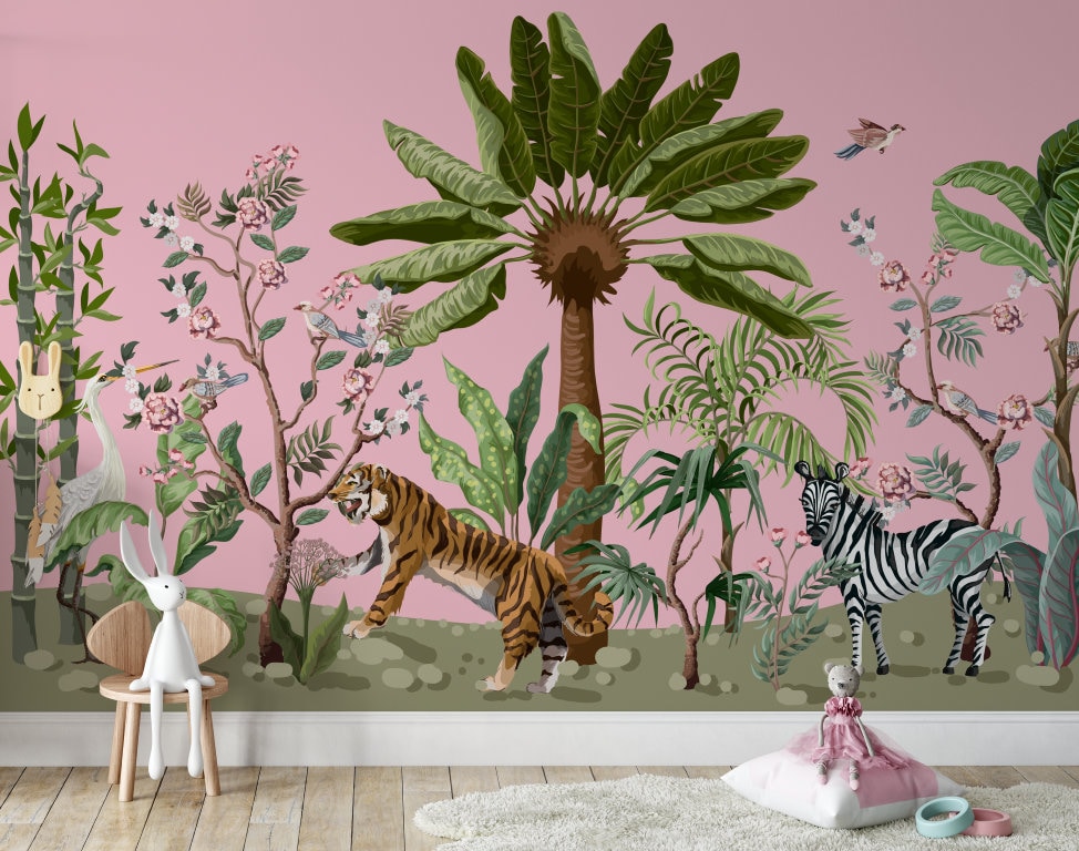 Zebra Angry Tiger Coconut Tree on Pink Background Wallpaper Self Adhesive Peel & Stick Wall Stic...