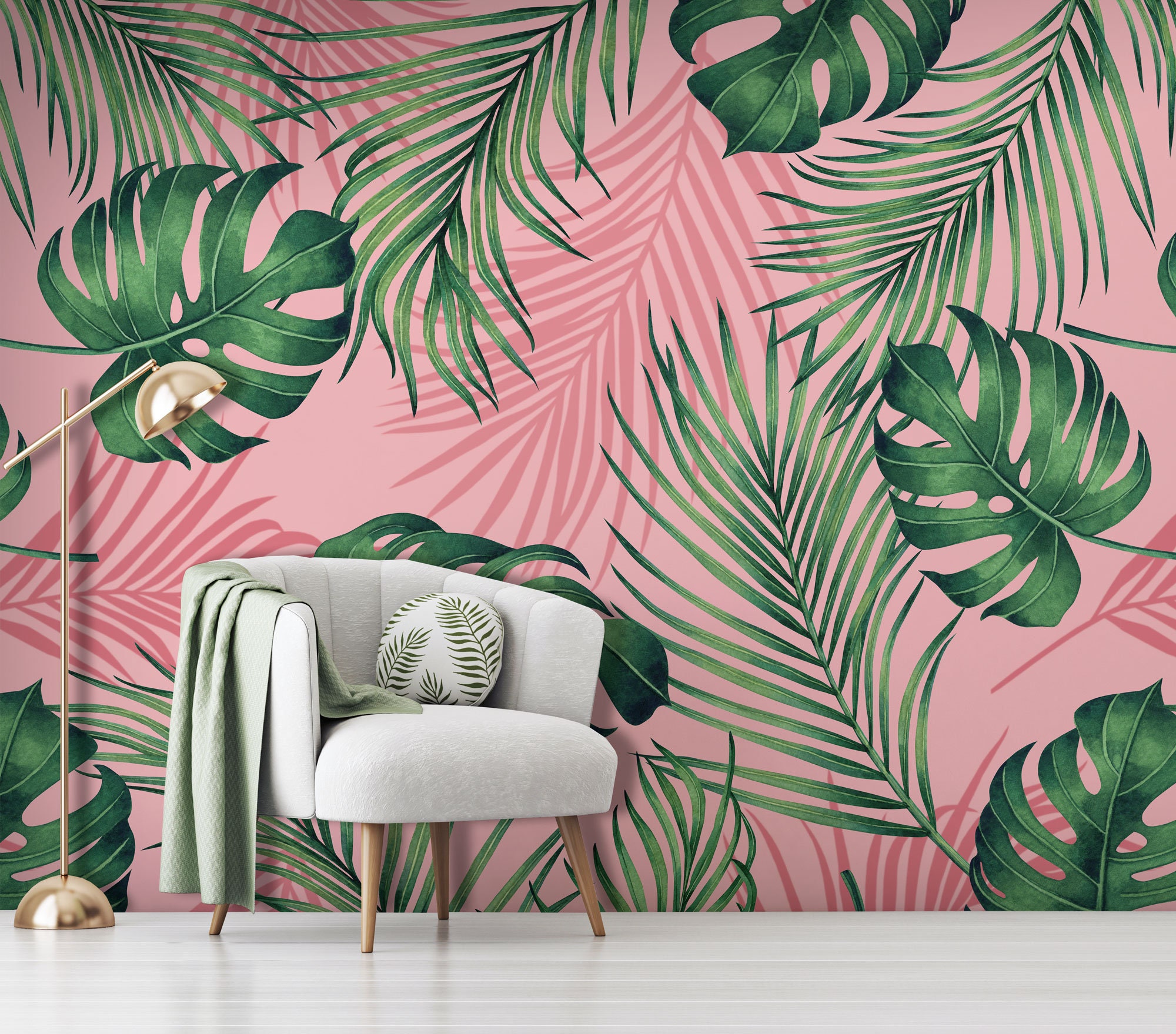 Monstera wallpaper, coconut leaves pattern, palm, pink leaf, tree t...