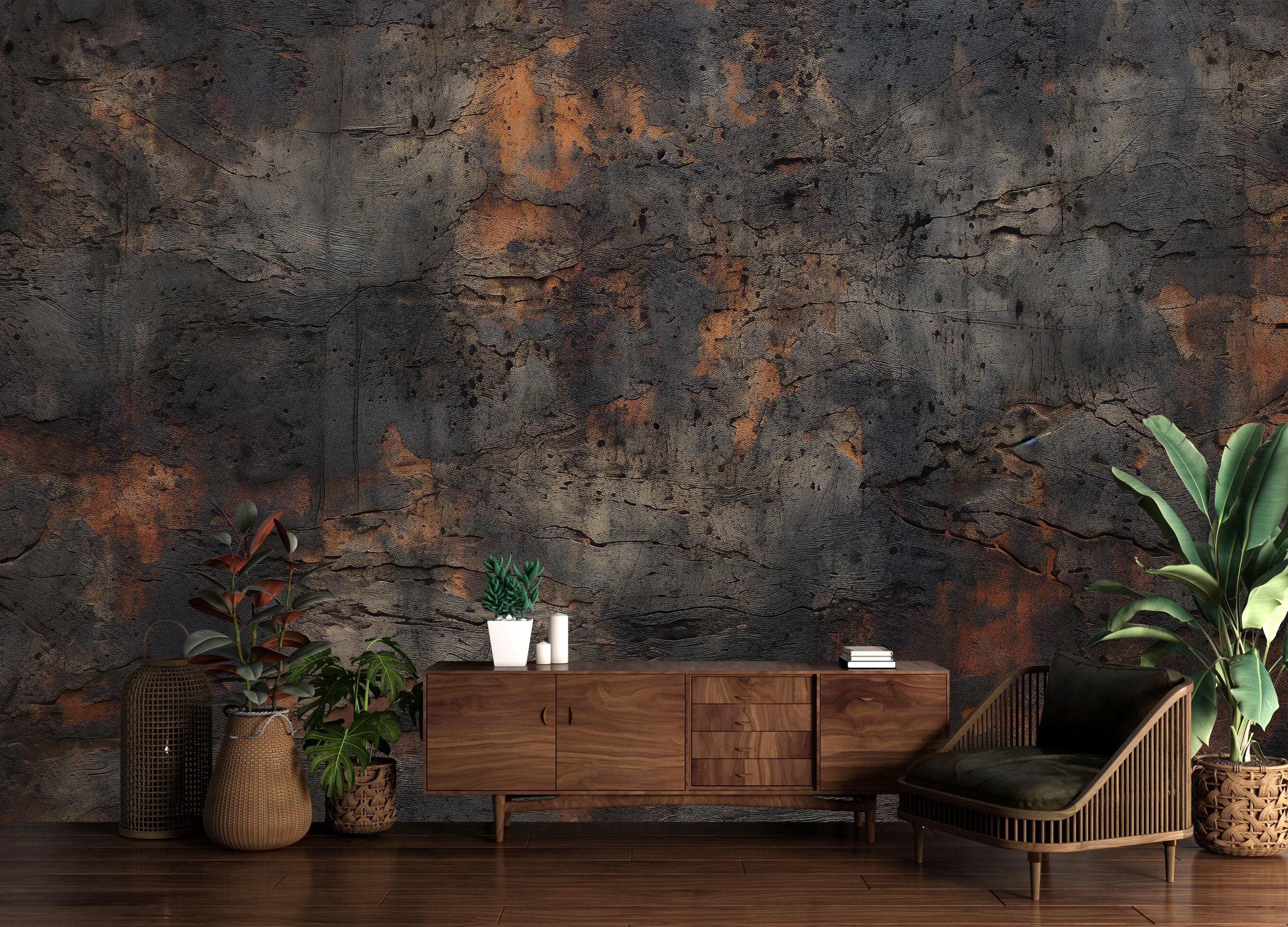"Black Copper Textured Wallpaper Peel and Stick,Dark Rusty Mural,Grunge Wall Decor,Ancient Wall...