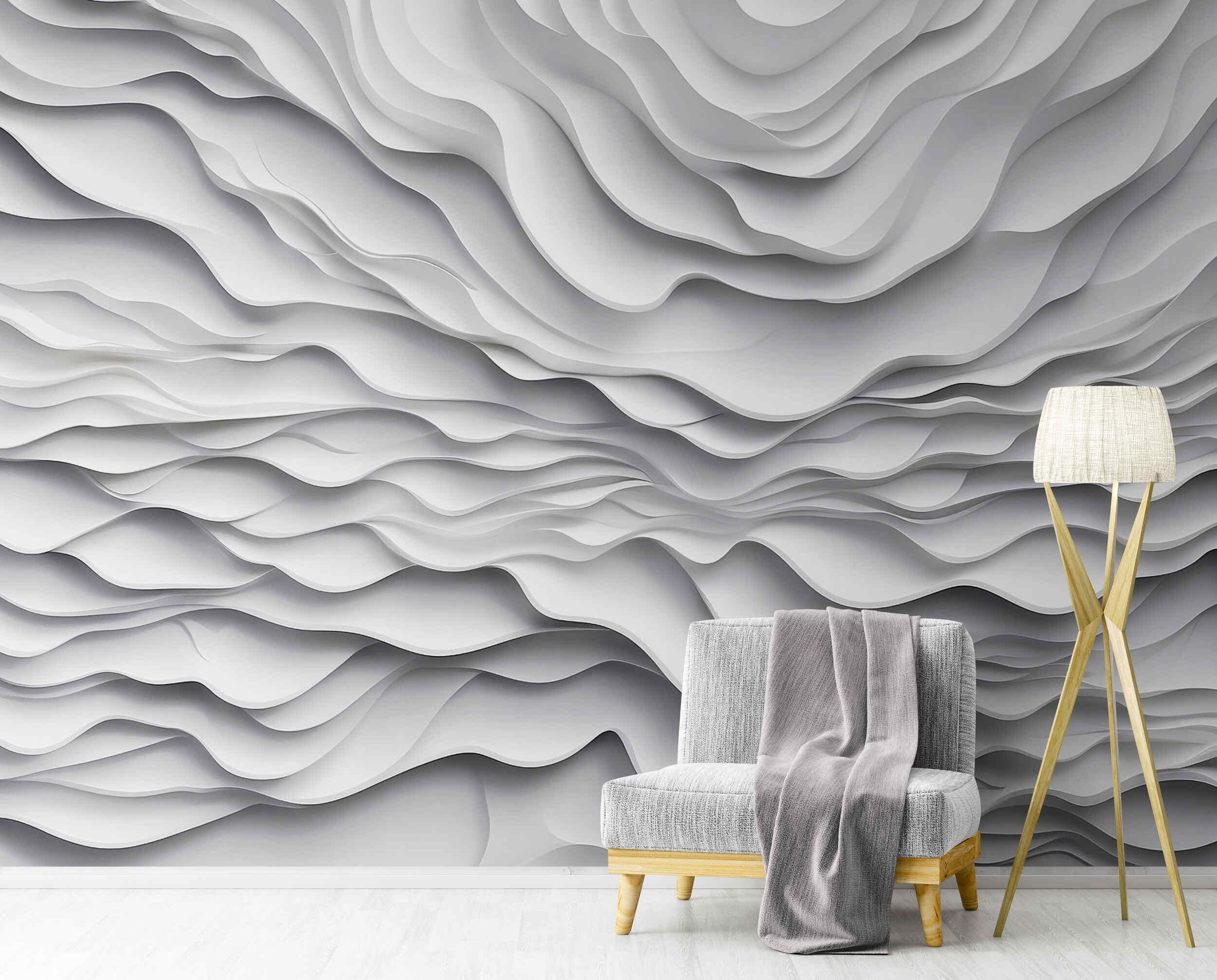 Perfect Modern 3D Gray Wave Wall Mural, designed with soft, layered curves in soothing neutral tones...